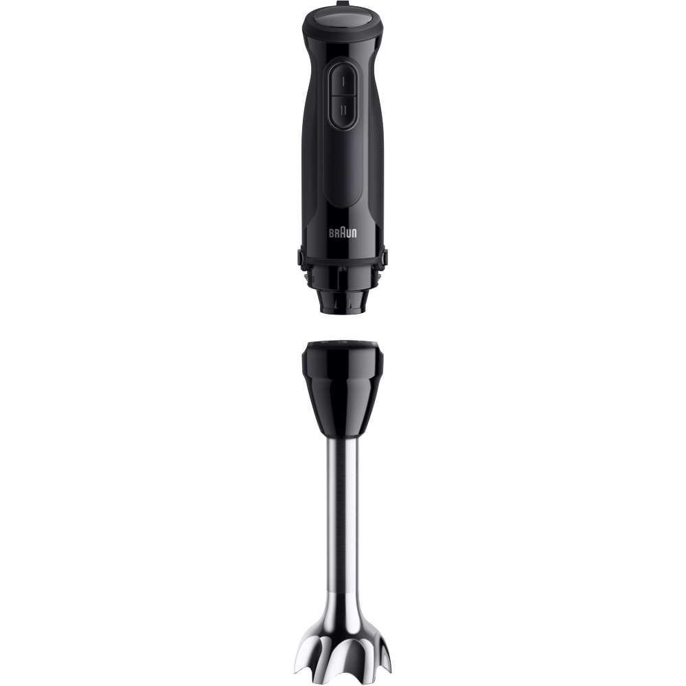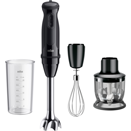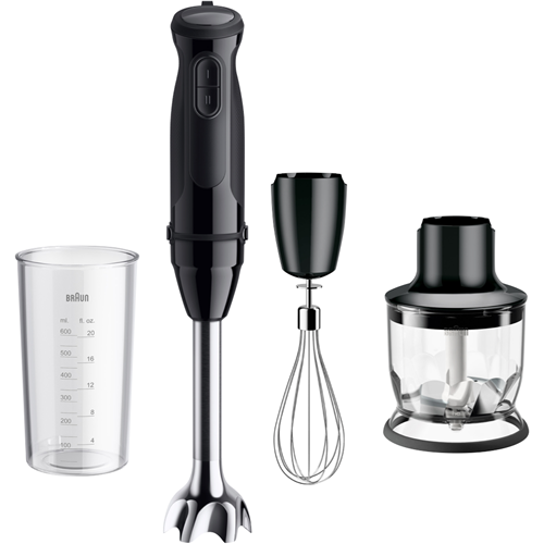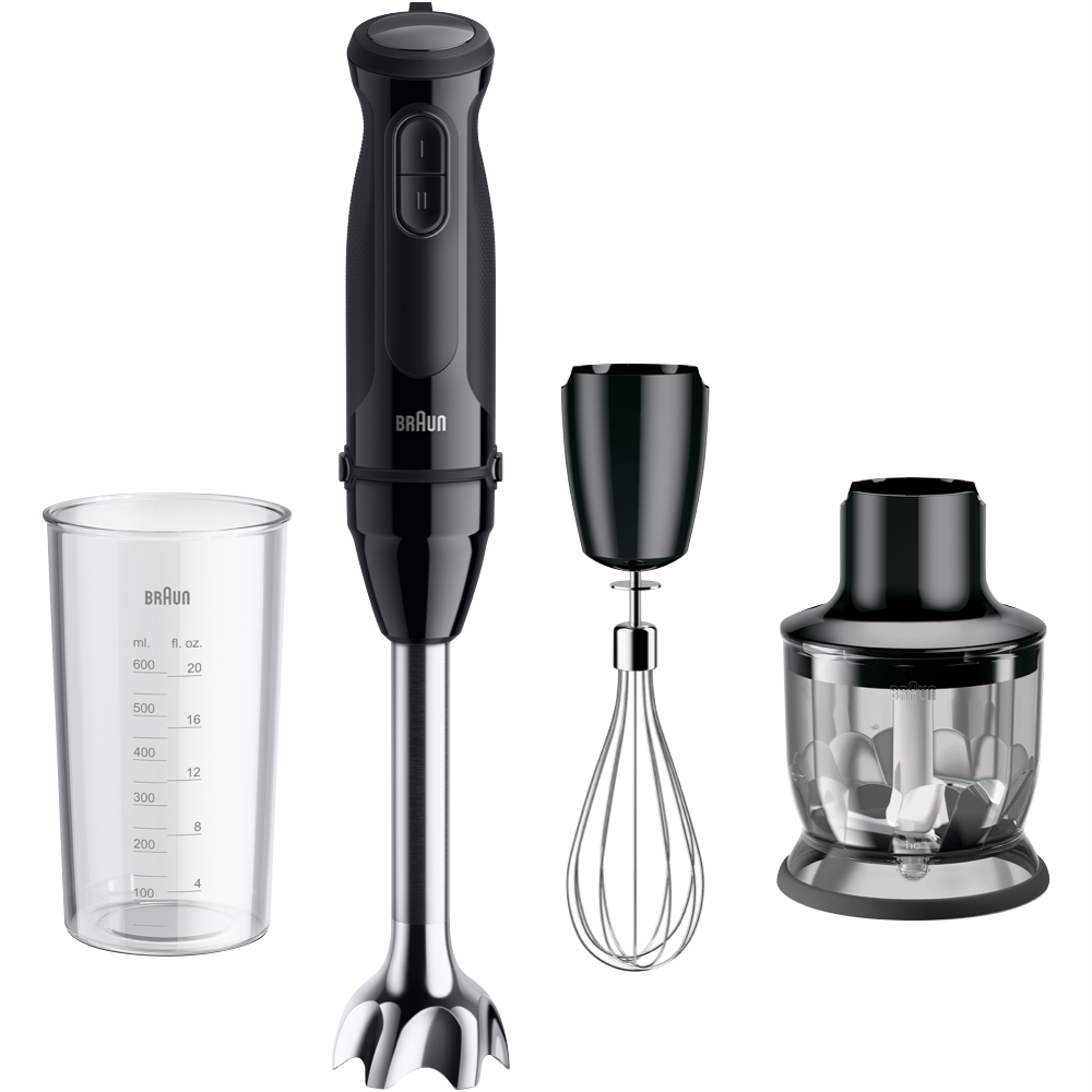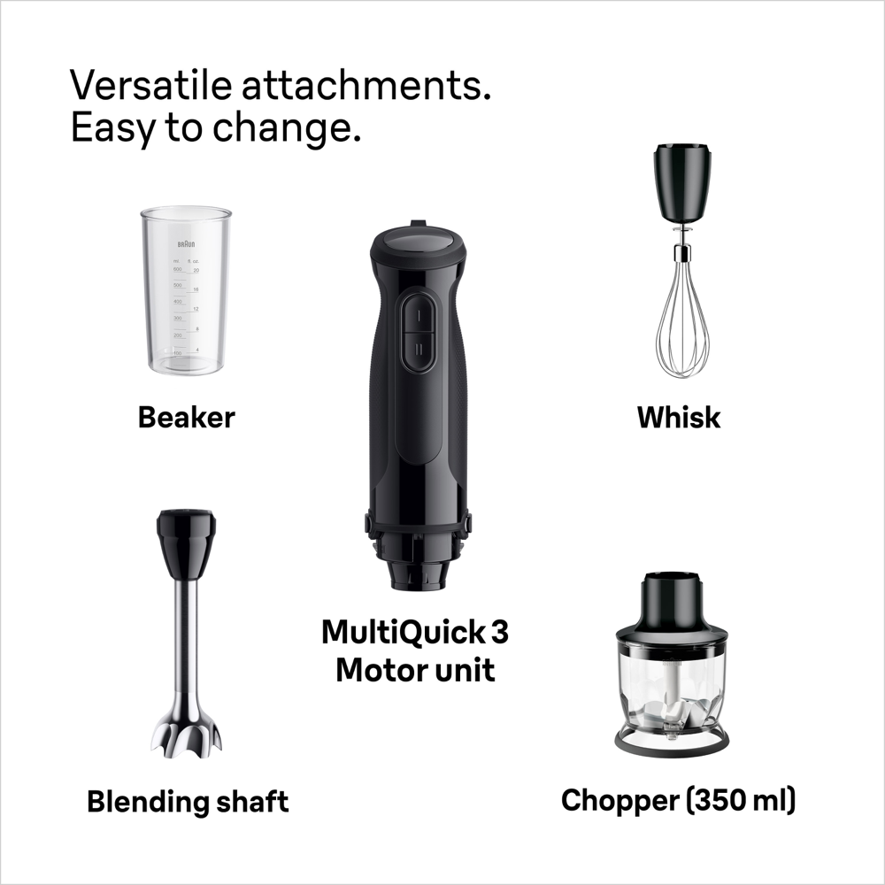 Ever wanted to whip up a smoothie or chop veggies in seconds without the fuss? The MultiQuick 3 Hand Blender makes everyday kitchen prep simple with two speeds and a dual speed control that lets you blend or chop with just one hand. SplashControl Technology keeps your benchtop tidy while the ergonomic grip handle means you stay comfortable even when mixing tougher ingredients. You get a 350ml chopper accessory whisk and beaker all with dishwasher safe parts to save you time on clean-up. Covered by a two year warranty for peace of mind. Model MQ30202MBK.