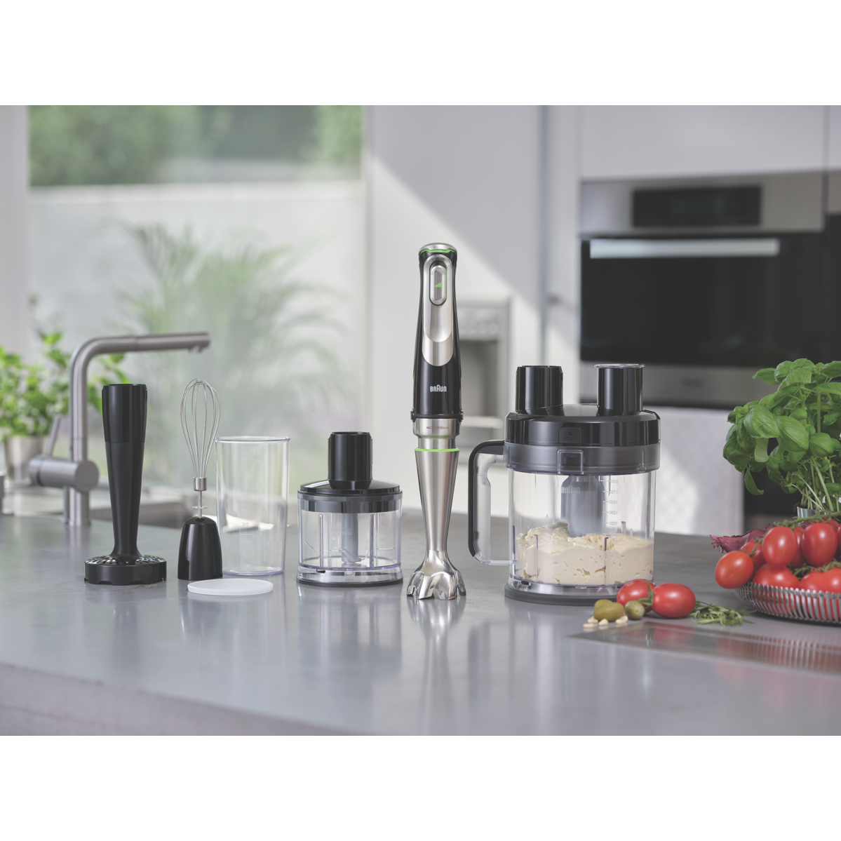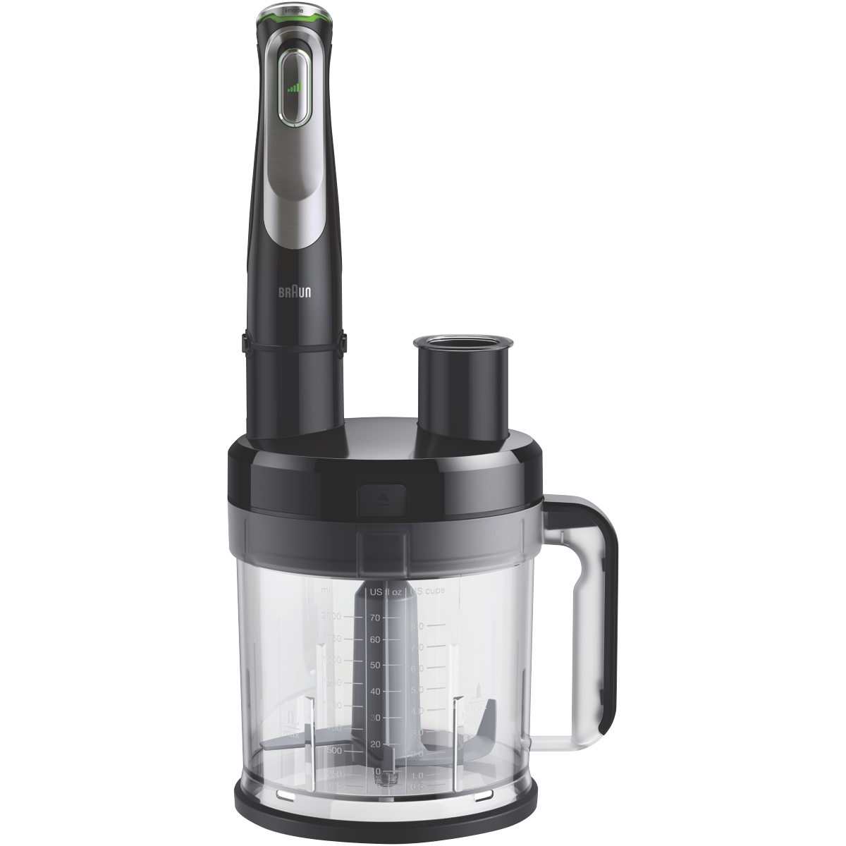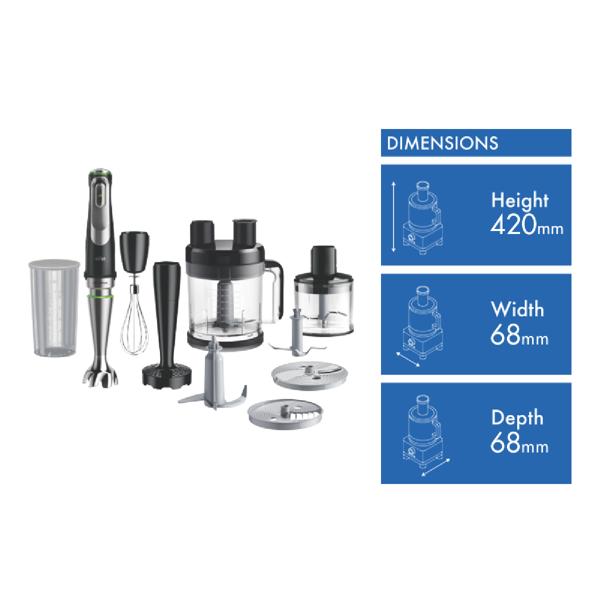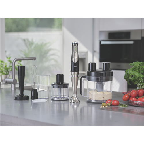 Blend chop slice grate knead whisk and mash all your favourite meals by using the all-in-one Braun MultiQuick 9 Hand Blender MQ9187XLI. Active PowerDrive Technology alongside Braun's greatest performing and most powerful hand blender offers up to 60% faster processing performance. The effective 1200 Watt motor cuts through the toughest ingredients; you ll be able to create your favourite dishes in no time. The exceptional ActiveBlade Technology drifts up and down as it seamlessly glides around the chamber the advanced flexible shaft creates 250% more active cutting surface and 2x times finer blending. An attachment that does it all; blend slice shred and more in the XL food processor with 2L working capacity.