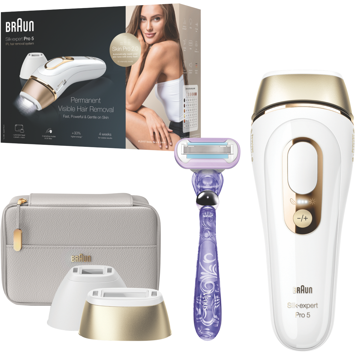 Get smooth hair-free skin in as little as four weeks with the Braun Silk Expert Pro IPL Machine. This advanced hair removal device uses Intense Pulsed Light technology to gently reduce hair regrowth over time suitable for skin tones 1-5. With a built-in SensoAdapt sensor it automatically adjusts light intensity for customized treatments. Treat legs in under 5 minutes and enjoy long-lasting results with 400000 flashes from the durable lamp. 10 energy levels let you tailor sessions from extra gentle to fast. The lightweight corded machine comes in a sleek white finish. Additional features include a Venus Swirl razor and storage pouch. Experience convenient at-home hair removal with this innovative IPL machine from Braun. Backed by a 2 year warranty. The manufacturer's part number for this product is IPL5157. Shop now for permanent hair reduction with advanced IPL technology.