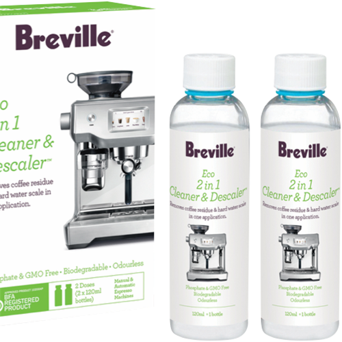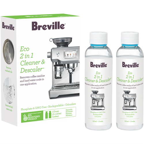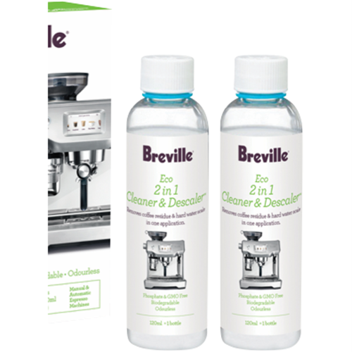 This Breville 2 in 1 Cleaner & Descaler is the ultimate cleaning solution for your coffee machine removing both coffee residue and hard water scale in one easy application. Specially formulated to be phosphate and GMO free while remaining biodegradable and odourless this cleaner descaler duo keeps your machine running like new. Just one 120ml bottle provides the precise single dose required to thoroughly clean your coffee maker. The dual-action cleaner descaler formula tackles buildup restoring your machine's interior to a sparkling clean finish. By removing mineral deposits and coffee oils this product helps maintain your coffee maker's optimal flavor extraction and temperature control. Give your coffee machine the tune-up it needs with this convenient 2 in 1 cleaning system. With regular use you'll enjoy reliably great-tasting coffee and long-lasting equipment performance. Your coffee maker is a prized kitchen appliance; care for it properly with Breville's Cleaner & Descaler. The manufacturer's part number for this product is BES014CLR0NAN1.