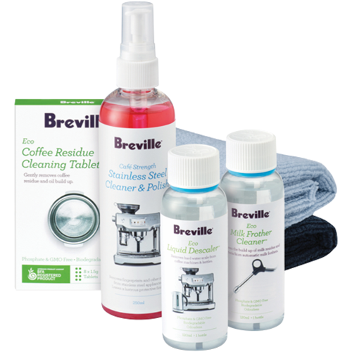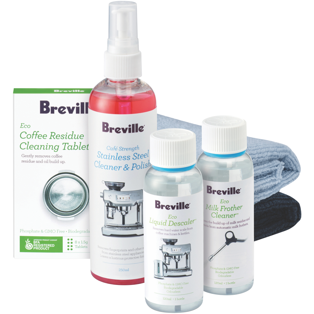 Additional Features Eco Descaler 120ml, Eco Milk Frother Cleaner 120ml, Eco Coffee Residue Cleaning Tablets 8%26#39;s, Microfibre Cleaning Cloths (x2), Stainless Steel Cleaner %26amp; Polish 250ml