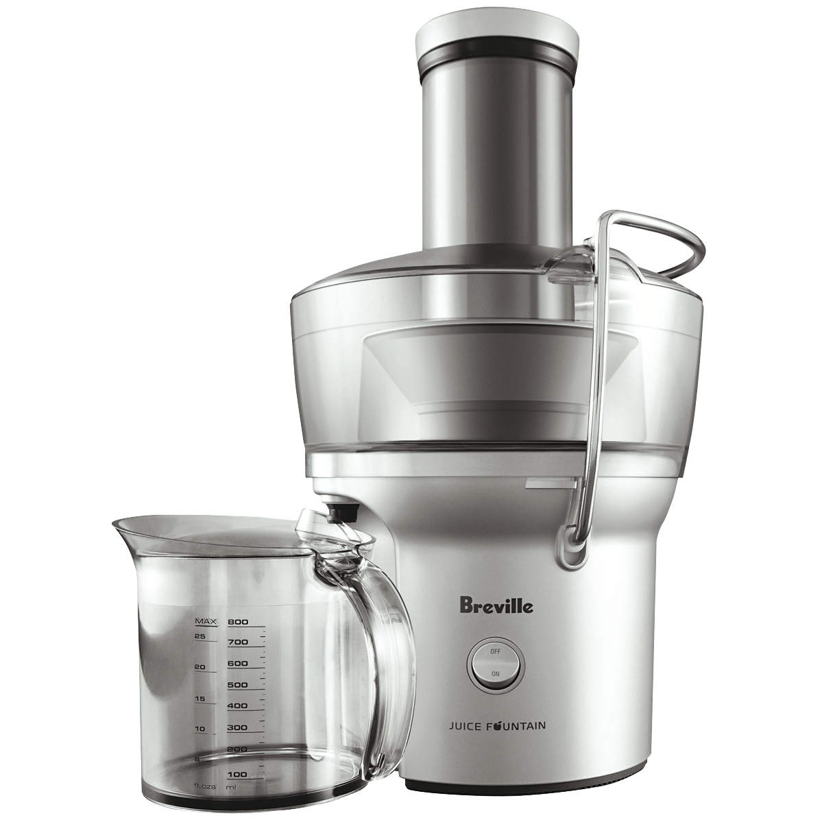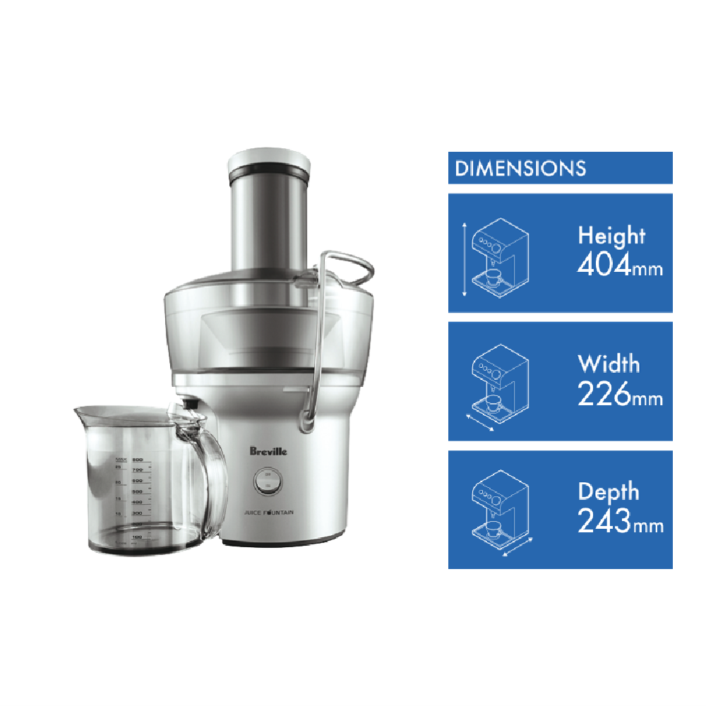 Juicing whole fruits and vegetables has never been easier. The Breville Juice Fountain 900W juicer features an extra wide feed chute that allows you to juice whole apples carrots tomatoes and more without pre-cutting. Its heavy grade polymer body and stainless steel cutters provide durability for years of juicing. With a powerful 900 watt motor 800ml juice jug capacity and 1.5L pulp container this juicer makes quick work of produce for nutrient-rich juices your whole family will love. The safety locking arm ensures safe operation. Vibrant homemade juices have never been simpler than with the Breville Juice Fountain. This juicer's versatility and robust construction make it a must-have for any kitchen. Enjoy the convenience of juicing whole fruits and vegetables with the Breville Juice Fountain 900W. The manufacturer's part number for this product is BJE200SIL. Give your health a boost with daily fresh juices from this innovative juicer.