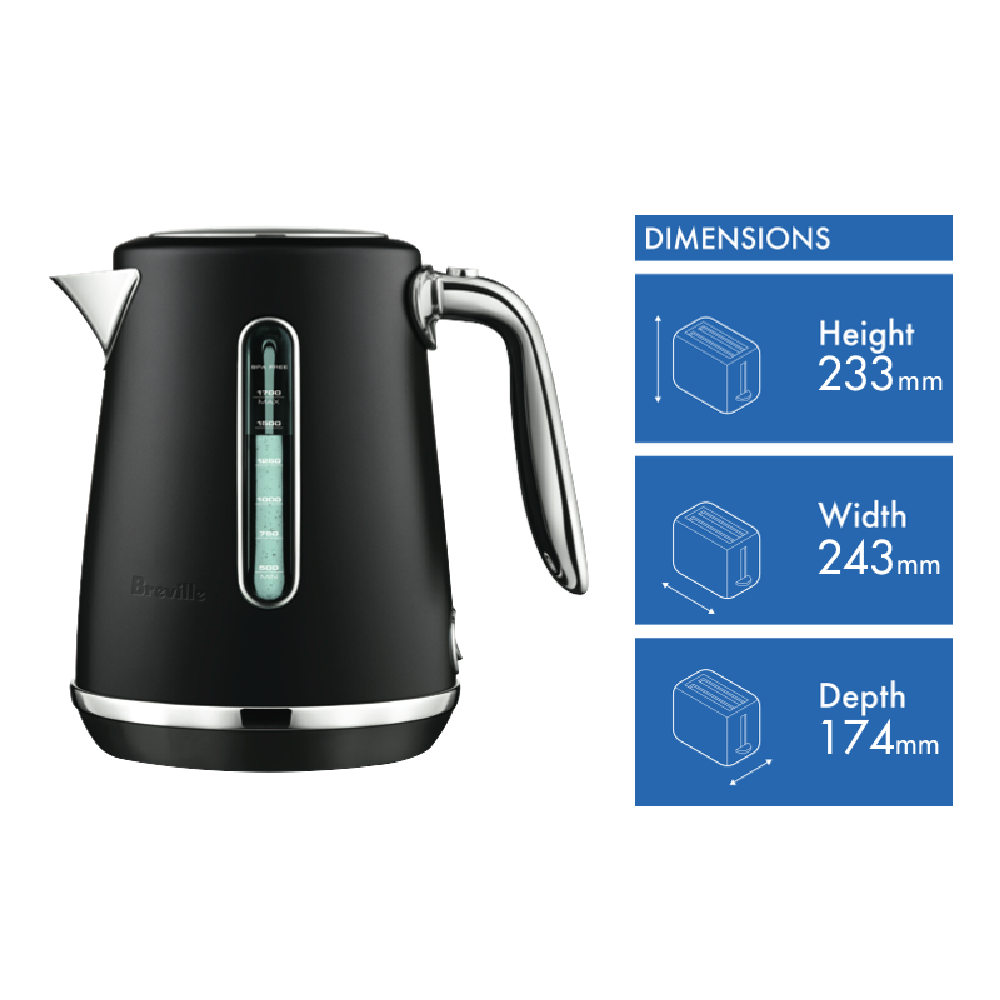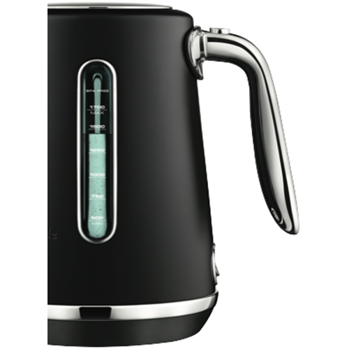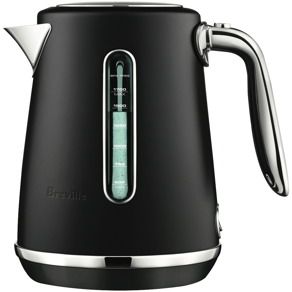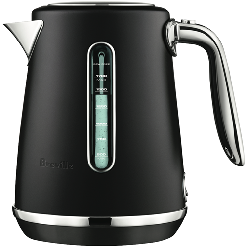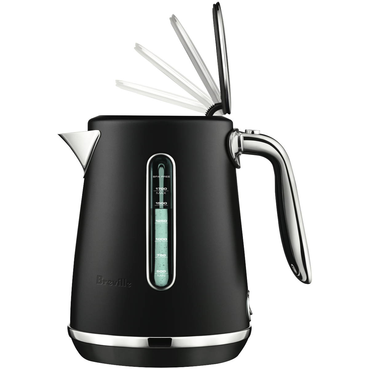 The Breville the Soft Top Luxe Kettle - Black Truffle BKE735BTR shines in any kitchen; the premium metallic finish with chrome accents using BPA free materials offers both amazing aesthetics and design to your kitchen. Prevent potential burns or injuries with the soft open lid which staggers hot steam and prevents hot water splash back. Be confident with your Breville the Soft Top Luxe Kettle with the safety auto shut off feature and boil dry protection. The clear view dual water windows provide the sight of exactly how much water you have left. Also the ergonomic non-slip handle prevents messes or accidental pouring to occur.