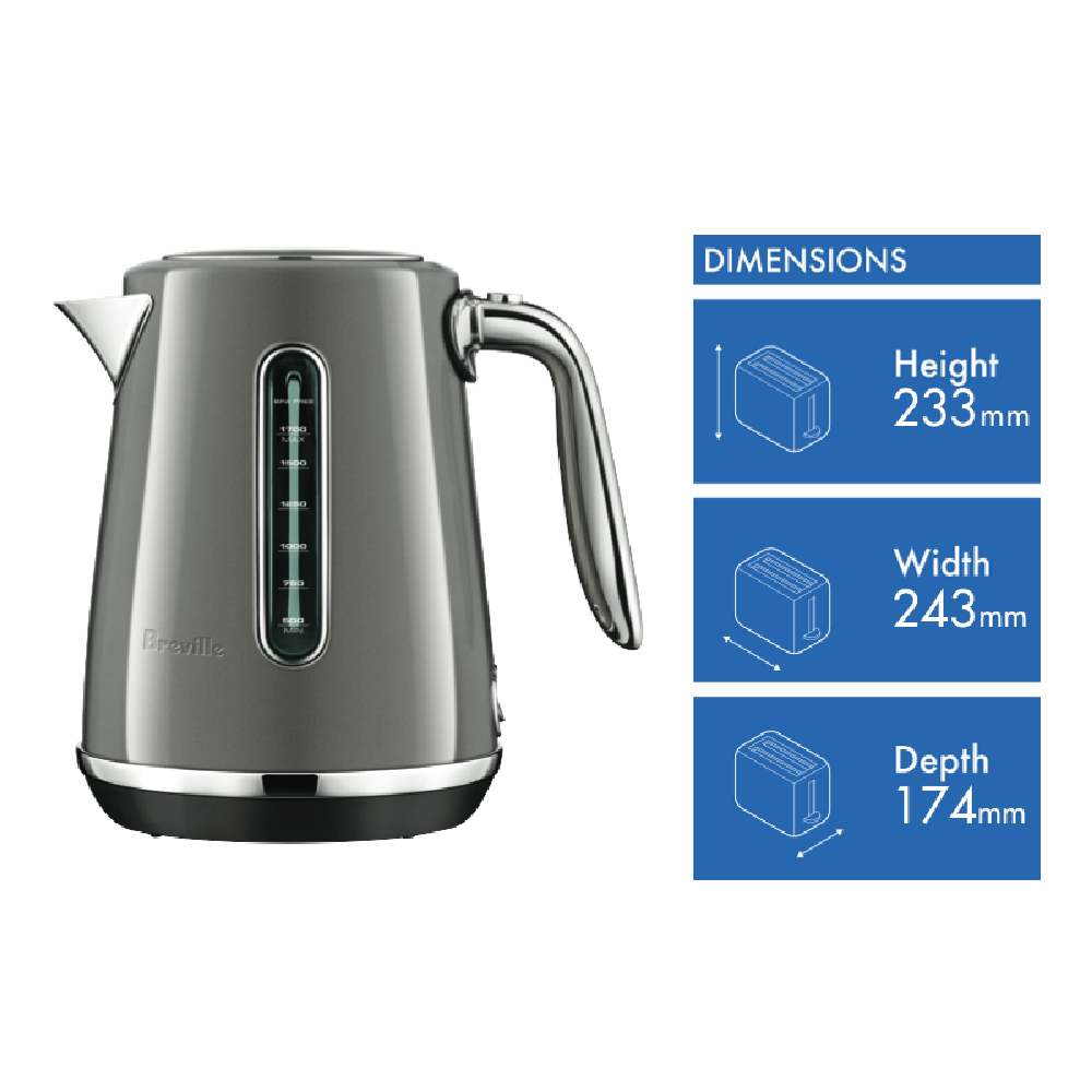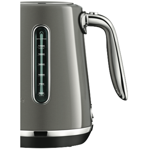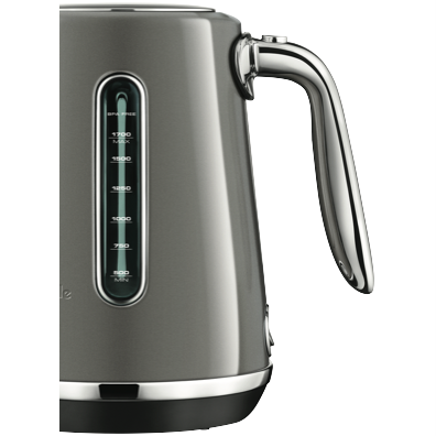 The Breville the Soft Top Luxe Kettle - Smoked Hickory BKE735SHY shines in any kitchen; the premium metallic finish with chrome accents using BPA free materials offers both amazing aesthetics and design to your kitchen. Prevent potential burns or injuries with the soft open lid which staggers hot steam and prevents hot water splash back. Be confident with your Breville the Soft Top Luxe Kettle with the safety auto shut off feature and boil dry protection. The clear view dual water windows provide the sight of exactly how much water you have left. Also the ergonomic non-slip handle prevents messes or accidental pouring to occur.