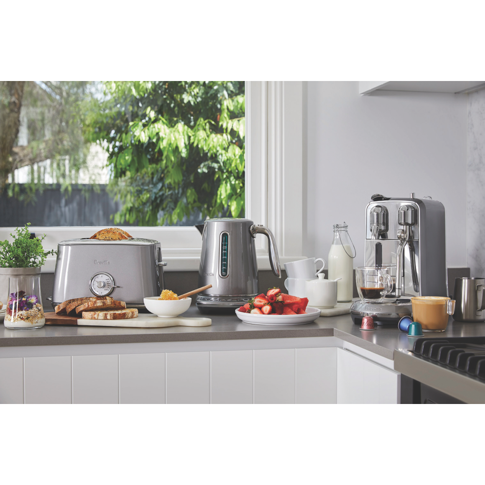 This Breville the Toast Select Luxe is a compact 2-slice toaster with quick and convenient features that help you perfect your morning toast with little effort. It cleverly adjusts the toasting time for each type of bread - just select from White Brown Grain Fruit Rye and Crumpet auto settings and the rest is taken care of for you. The Breville Luxe BTA735SHY easily handles larger pieces of bread thanks to the extra wide toasting slots. It has an 'A Bit More' button for extra toasting time if your toast comes up too light a browning control slider for toast your way and a 'Lift & Look' lever to check progress without interrupting the toast cycle. Plus this Breville toaster has an LED progress indicator and a sound alert for when your toast is ready. In a timeless smoked hickory colour with premium metallic finishes and chrome accents this incredibly versatile toaster also brings effortless style to your kitchen bench.