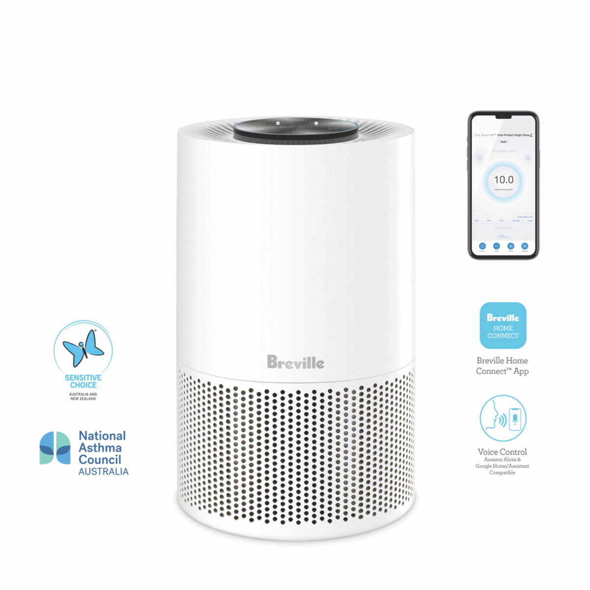 Breathe easy with the Breville Smart Air Viral Protect Night Glow. This sleek white purifier leverages cutting-edge filtration to actively remove airborne contaminants for cleaner healthier air in rooms up to 28sqm. Equipped with a medical-grade HEPA 13 filter and activated carbon it captures 99.97% of particles down to 0.3 microns including allergens pollutants viruses and bacteria. The Wi-Fi enabled design allows you to monitor air quality remotely while customizing operation via app or voice control. Set schedules activate aromatherapy or turn on the soothing night light with ease. Whisper-quiet at just 26 decibels it won't disrupt sleep. Enjoy two years of pristine air with the included filter. LAP168WHT.