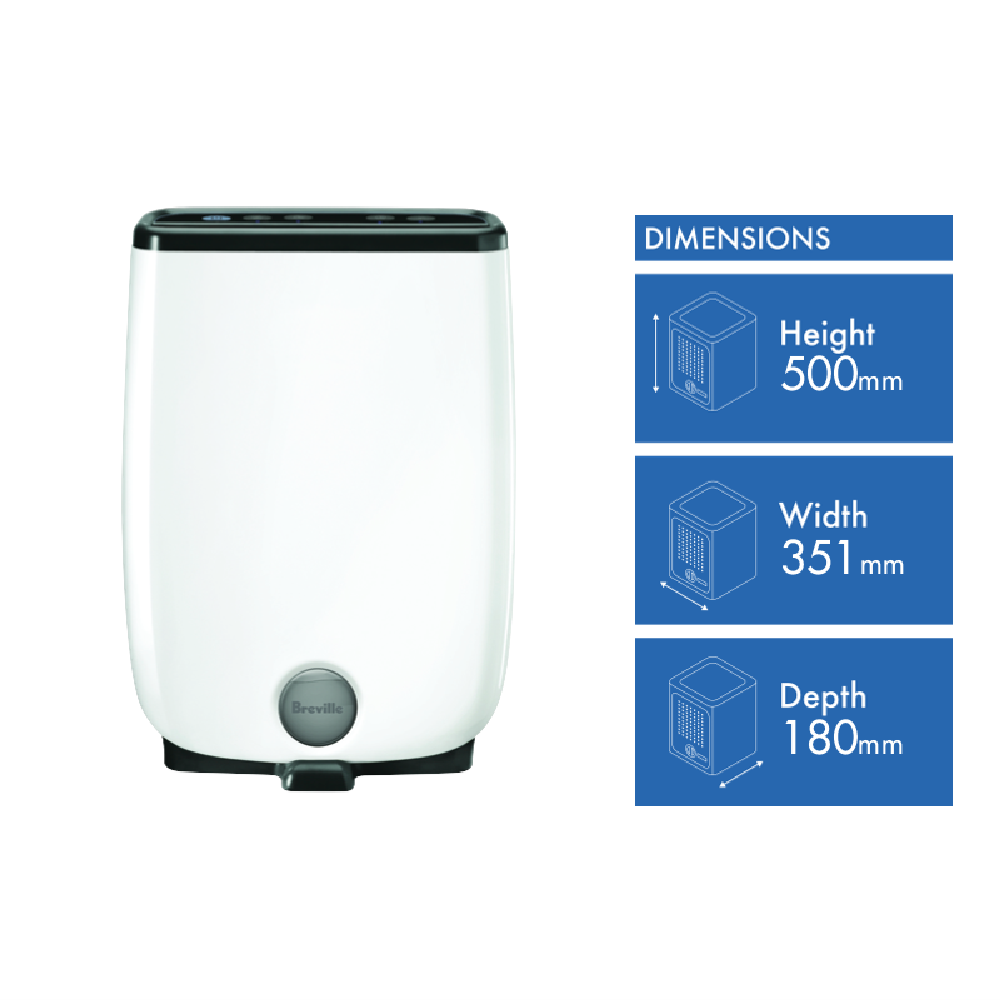 Extract the extra moisture in the air with The All Climate Dehumidifier by Breville. The LAD250WHT is perfect for both cold and warm environments and great for those hard to control areas such as your laundry. This Breville dehumidifier features The Sensair System that automatically keeps the humidity in your comfort zone by setting the appropriate level and allowing the dehumidifier to do the rest of the work depending on room temperature. Plus this dehumidifier removes any dust and allergens from the air by producing negative ions that attach to floating particles. This All Climate Dehumidifier has a two-stage air filtration: a pre-filter and carbon filter that reduces dust pet dander odours and smoke and any other allergens so that the air you breathe is cleaner. This dehumidifier is also environmentally friendly and contains silica dioxide crystals to absorb moisture that is non-toxic and reusable. Enjoy cleaner air with The All Climate Dehumidifier by Breville.
