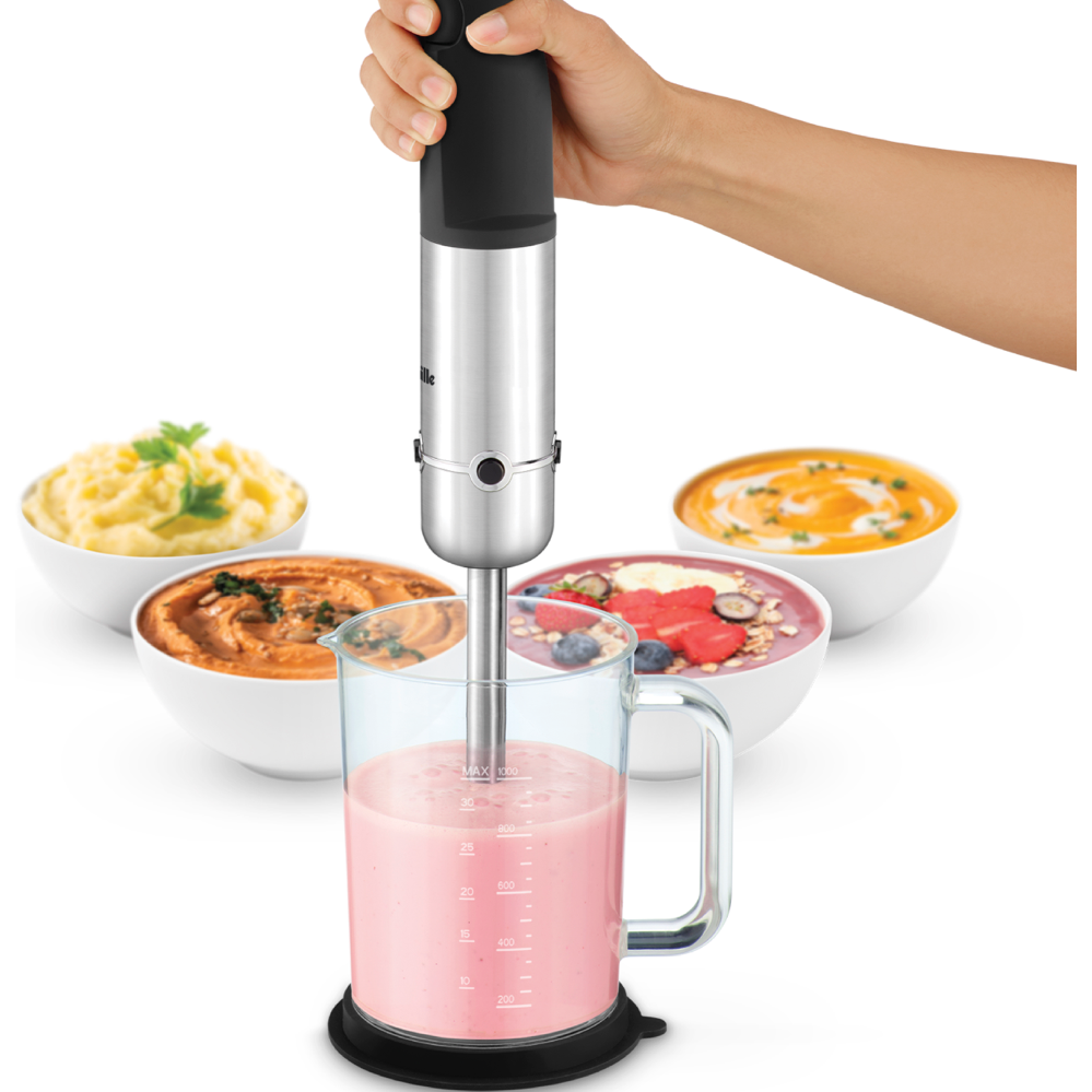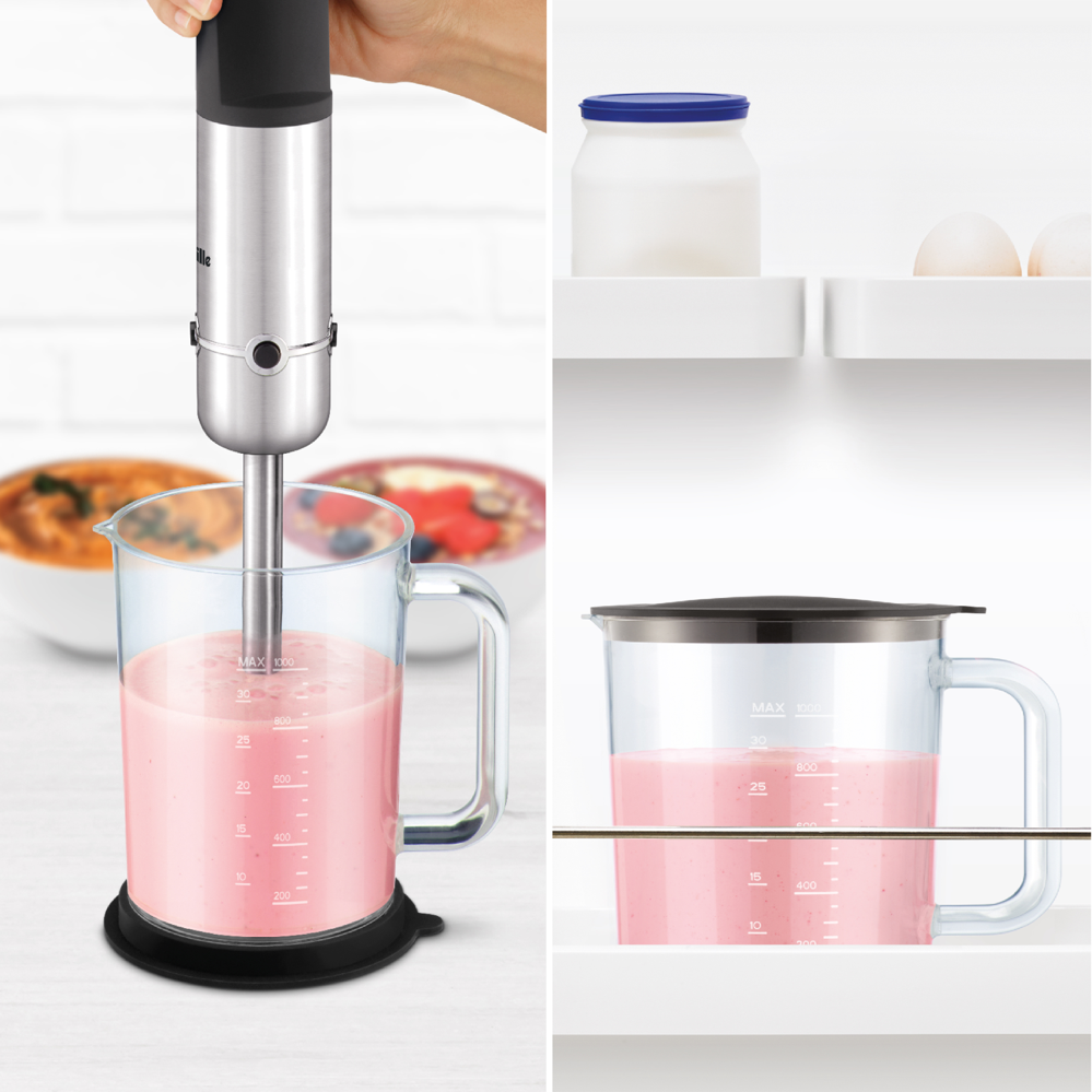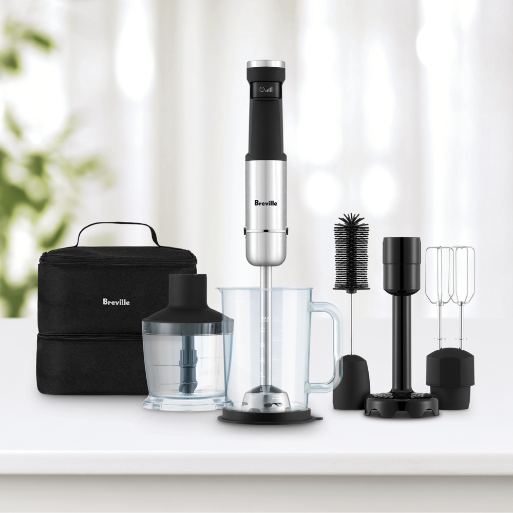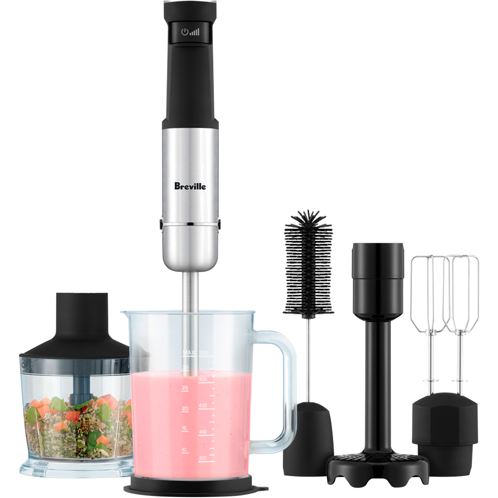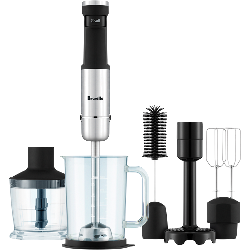 Blend chop and mix with this versatile cordless stick blender that offers 10 speed settings controlled by a simple trigger switch. The 200W motor is designed with built-in overload protection and a 2-step safety mechanism that requires you to press the trigger twice for secure operation. You can easily monitor battery life and speed on the digital display while the dual-purpose silicone lid serves as both a non-slip mat during blending and a leak-proof lid for storage. Comes with a stainless steel blending shaft 500ml chopping bowl 1L blending jug beaters masher cleaning brush and storage bag. 1 year warranty. Model LSB150BSS0ZAN1.