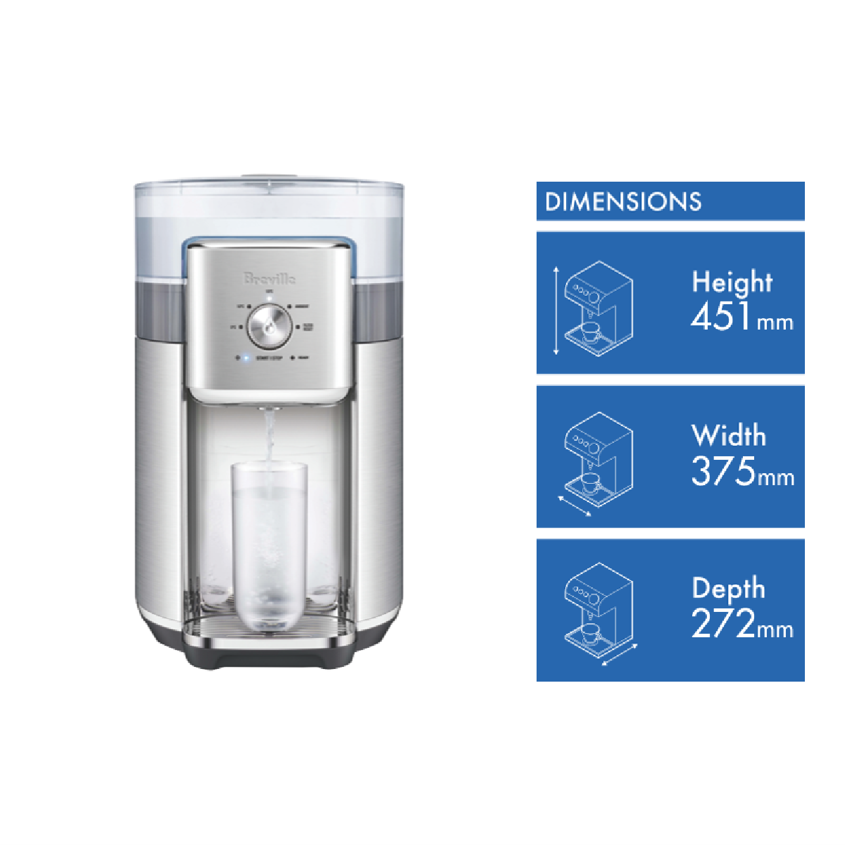 Transform your kitchen into a refreshing oasis with the Breville The Aquastation Chilled. This brushed stainless steel water station features Breville's innovative Activ360 4-stage filter system to deliver clean filtered water on demand. With a generous 8 litre total capacity and extra-large 6 litre removable tank you'll always have chilled water ready. The floating sensor automatically stops dispensing when water is low. Maintain your hydration with the Aquastation's 200 litre filtered water capacity before replacing filters. Measuring 375mm wide by 272mm deep by 451mm high the compact Aquastation fits most kitchen benchtops. The 100 watt system chills municipal tap water from 5°C to 15°C perfect for refreshing drinks without ice. BPA free and complete with a 2 year manufacturer's warranty the Aquastation brings chilled filtered water to your home. The manufacturer's part number for this product is LWA300BSS2IAN1. Make the Breville Aquastation Chilled your go-to for cool clean water.
