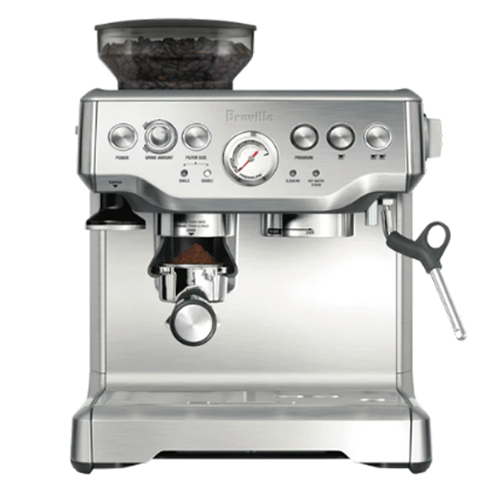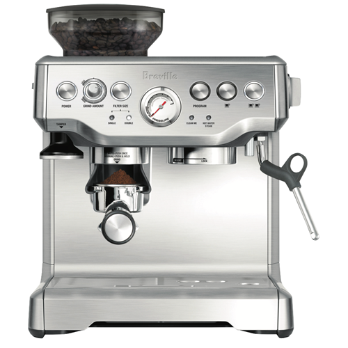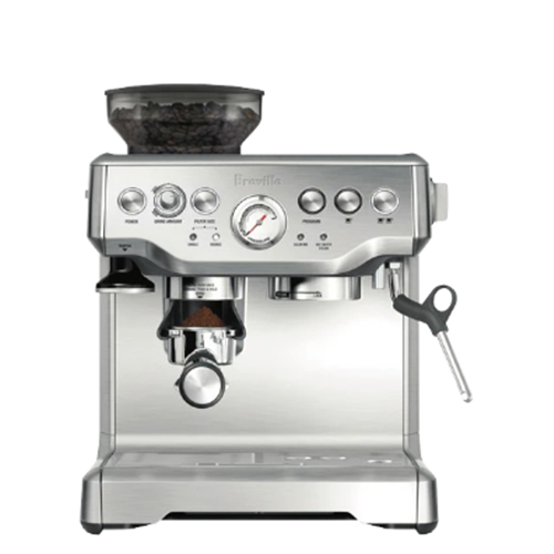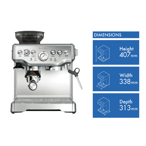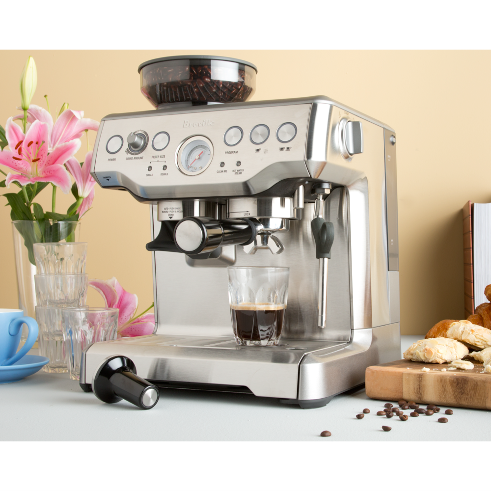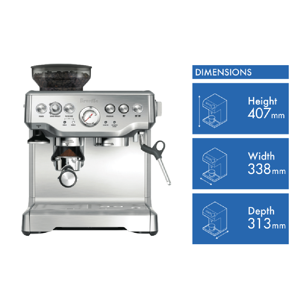 Kick start your day with cafe-quality coffee from the comfort of home with this stainless steel Breville the Barista Express BES870BSS - the perfect coffee machine for both beginner baristas and more experienced coffee makers. Simply add your favourite roasted beans to the bean hopper then press a button to let the machine grind and dose your portafilter with the right amount of freshly grounded coffee for a delicious tasting brew. Select your preferred cup volume and the machine's automatic dosing will dispense the required amount of coffee. It has an adjustable grind size dial for coffee your way. To create cappuccino flat white or latte use the steam wand to texture and heat the milk to a silky-smooth consistency. This Breville espresso machine uses preinfusion to gradually increase water pressure to gently expand grinds for even extraction. Plus it automatically adjusts the water temperature after steam for optimal espresso temperature. You can experience an authentic tasting espresso or milky coffee favourite with this Breville the Barista Express coffee machine.