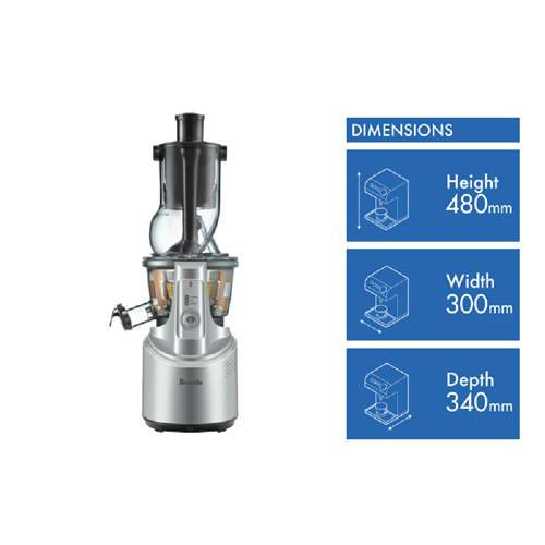 Make juicing easy with the Breville The Big Squeeze Slow Juicer. This powerful 2400-watt juicer features a large feed chute designed to easily accommodate whole fruits and vegetables eliminating the need for pre-chopping. The two speed settings allow you to customize juicing for soft or hard ingredients. The 1.5L pulp container and 1.2L juice jug let you juice large batches in one go. At 300mm wide 480mm high and 340mm deep this compact juicer takes up minimal counter space. Weighing just 7.4kg it's easy to move and store. Standout features like the ultra-quiet motor Quick Rinse technology and Big Squeeze slow juicing deliver the ultimate juicing experience. With a 5-year warranty you can juice every day with confidence. This Breville juicer makes it simple to enjoy fresh nutritious juice at home. The manufacturer's part number for this product is BJS700SIL. Discover how easy and delicious juicing can be with the Breville The Big Squeeze Slow Juicer.