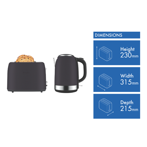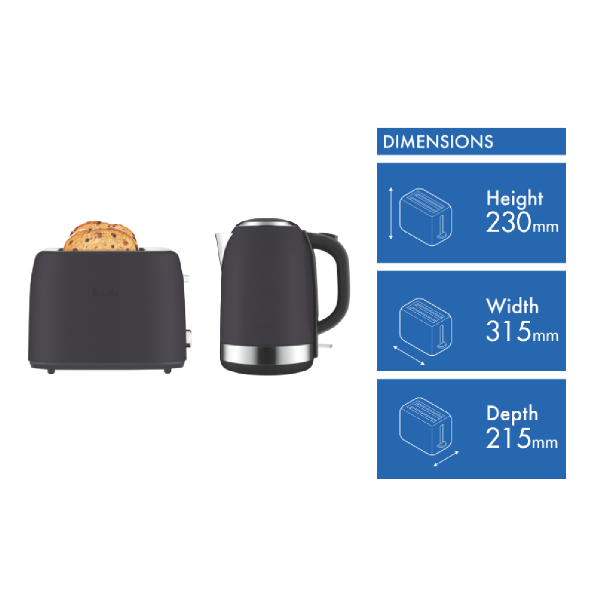 Start your mornings right with the sleek Breville The Breakfast Set. This stylish bundle pairs a high performance 2-slice toaster with a rapid boil kettle for effortless breakfast preparation. Crafted in chic midnight black stainless steel it brings sophistication to any kitchen.The 1800W toaster features extra wide slots perfect for thick artisanal breads bagels and brioche. With variable browning control you can customize results from light golden to deep crisp. The high-lift lever makes removing smaller pieces safe and easy. Other highlights include a removable crumb tray for quick cleanups cancel/reheat/defrost settings and concealed cord storage for a tidy countertop footprint. Meanwhile the 1.7L cordless kettle boils up to 5 cups of water in just minutes. The 360° rotational base provides flexibility. An auto-shutoff function prevents overheating and dry boiling. A handy water window lets you see fill levels at a glance. The washable scale filter improves flavor. This BPA-free jug is illuminated for nighttime use. An included lid release button facilitates pouring.With thoughtful touches like rapid boiling and wide slots this breakfast duo streamlines your morning routine. The manufacturer's part number for this product is LKT640MDB2IAN1. Add this sleek set to your cart to enjoy better breakfasts with less hassle.