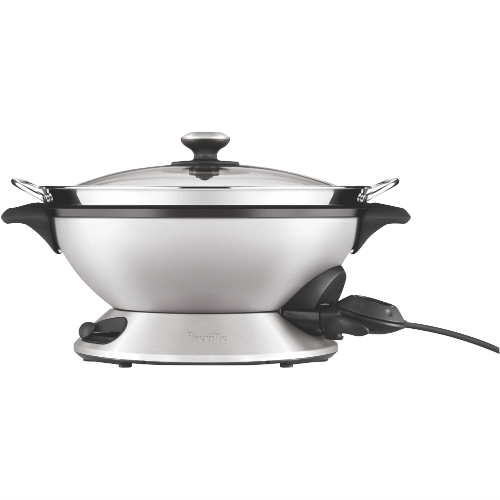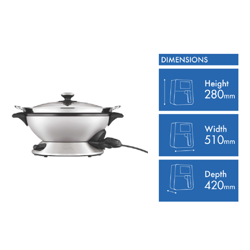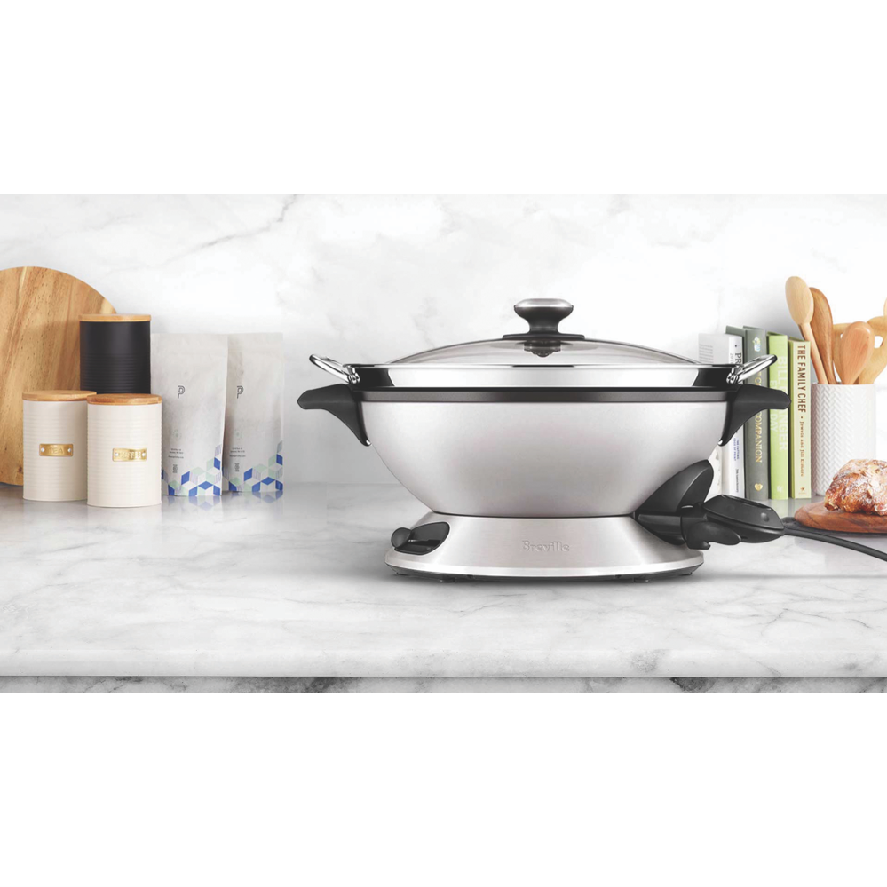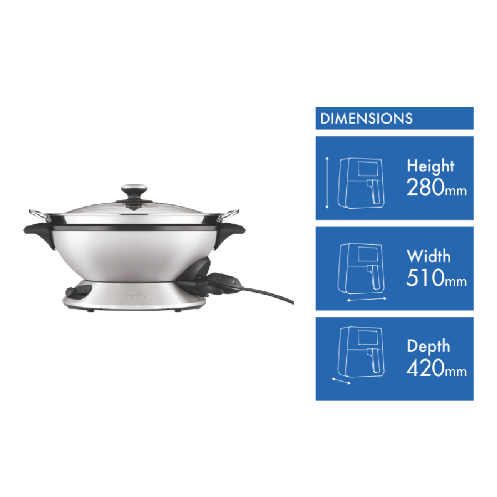 Transform your cooking with Breville The Hot Wok & Steam. This versatile 38cm wok delivers six cooking options - caramelize simmer steam fry stir fry and keep warm - all powered by 2400 watts. The butterfly heating element spreads heat evenly up the high walls while the eternal PFOA-free non-stick surface makes cleanup simple. Need to steam? Just insert the included stainless steel tray to cook a 2kg duck two plate-sized snappers or up to 16 dumplings. The generous 8 litre capacity handles family meals with ease and the tempered glass lid lets you monitor cooking progress. Both the bowl and lid are dishwasher safe saving you time after dinner. The brushed stainless steel base with cast aluminium cooking surface looks great in any kitchen. Comes with a 1 year warranty. Model number: BEW820BSS.