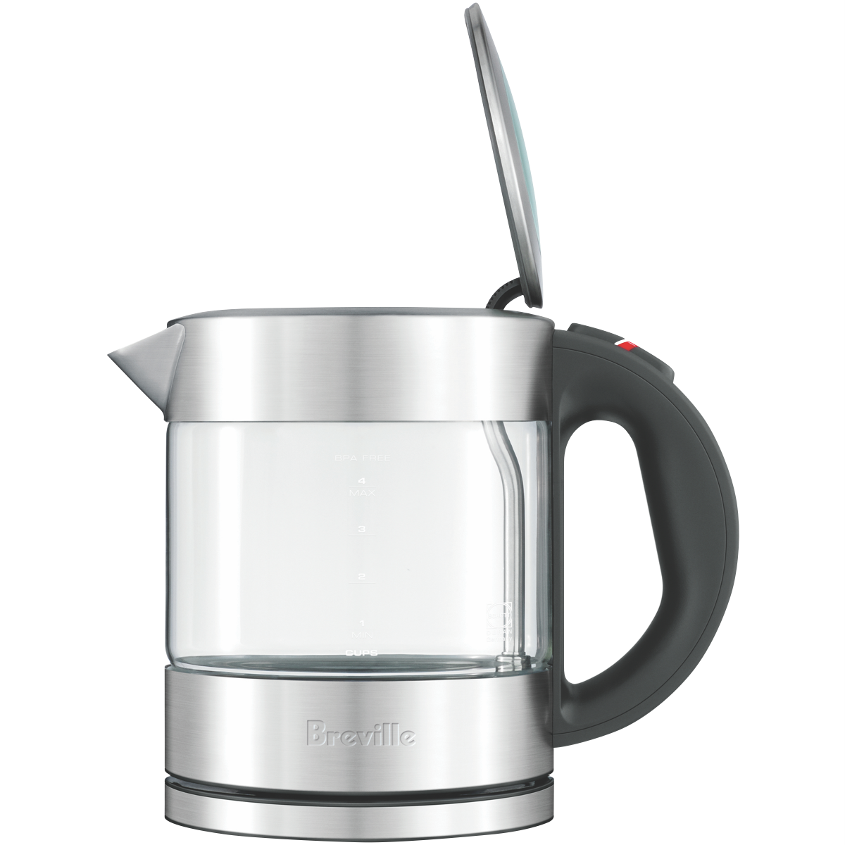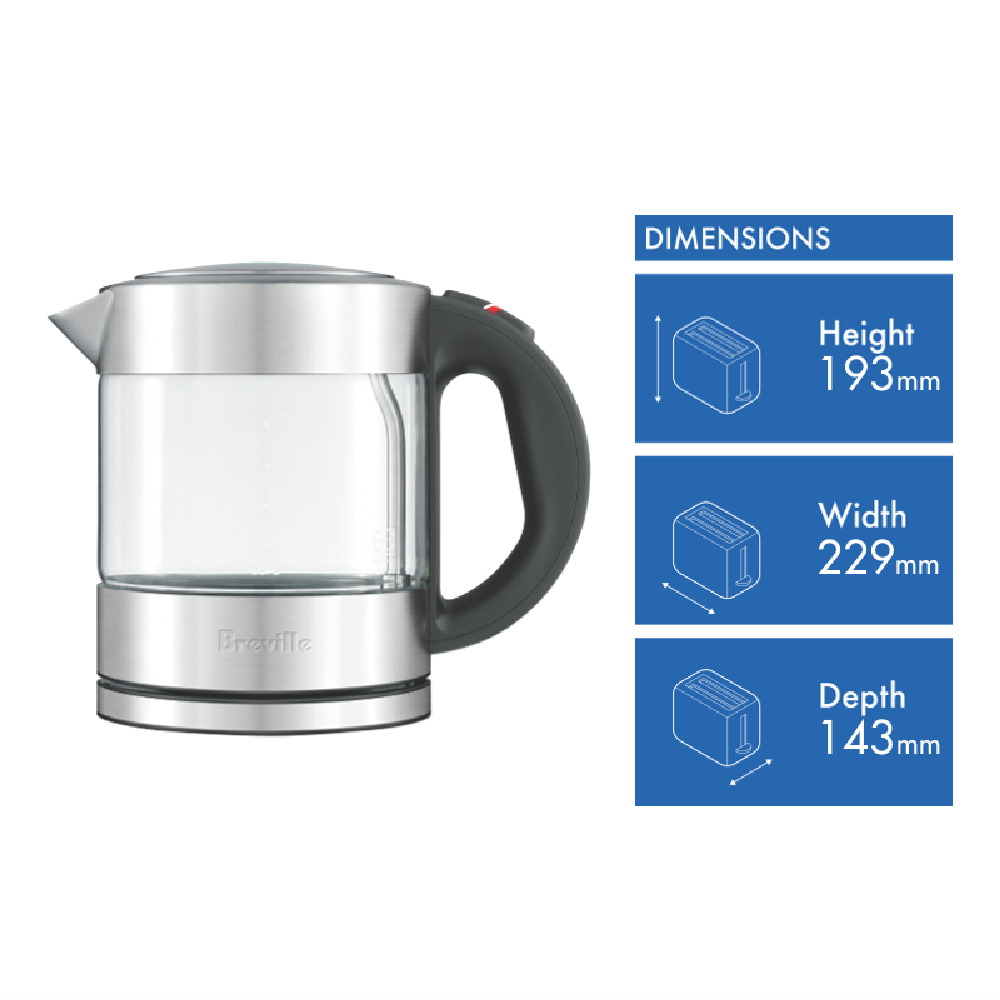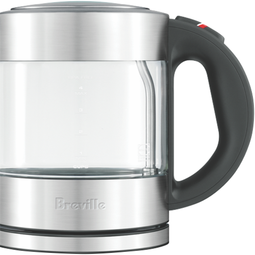 Prepare delicious beverages with the Breville THE COMPACT KETTLE PURE. This clear 1L kettle crafted from durable stain-resistant thermal shock resistant glass allows you to monitor water levels while heating. The soft tip lid provides a smooth drip-free pour and the 360° multi-directional cordless base enables convenient placement. With rapid boil technology this kettle boils water faster than a microwave. The auto shut-off and boil dry protection give you peace of mind and the wrap-around cord storage keeps your countertop clutter-free. Whether you're preparing tea coffee instant meals or baby formula this Breville kettle makes it easy. The manufacturer's part number for this product is BKE395. Shop now and enjoy hot beverages with ease.