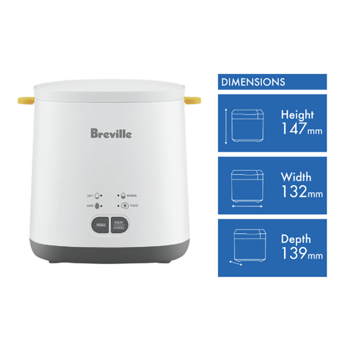 With its sleek modern design and intuitive operation the Breville The Eggspert 4 Up makes perfect eggs every time. This must-have kitchen appliance allows you to cook up to four eggs at once with its innovative egg rack and poaching tray that have easy-lift handles for quick removal and storage. Its 400W power ensures fast cooking while the included BPA-free dishwasher safe accessories make clean up a breeze. Ideal for all your egg cooking needs from poached to scrambled to omelettes this versatile egg cooker delivers restaurant-quality eggs with the touch of a button. Key features like an auto-off function and ready indicator beeps let you know when your eggs are done to your liking. Measuring just 138.5mm long by 132.2mm wide by 147.3mm high and weighing 900g the compact Eggspert 4 Up by Breville is the ultimate egg cooker for any home chef. With a 1 year warranty you can cook up delicious eggs for your family every morning knowing this quality appliance has you covered. The manufacturer's part number for this product is LEG400MTW2JAN1.