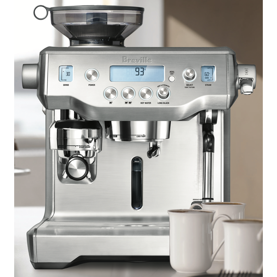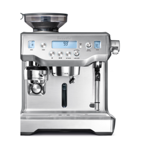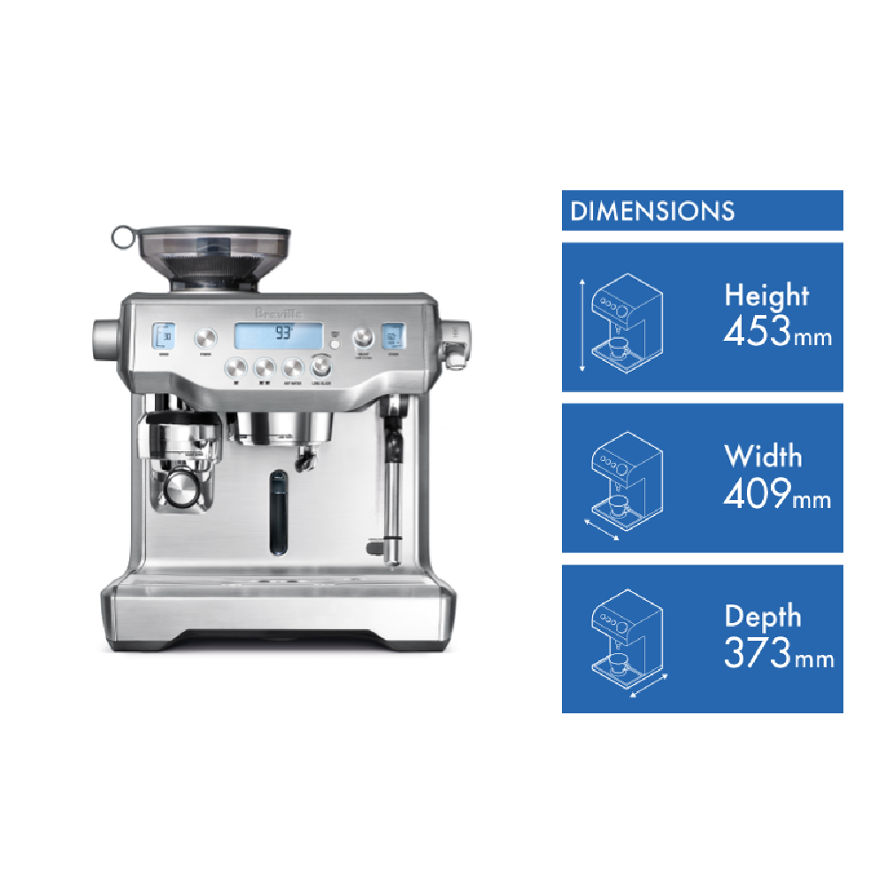 Step into the world of cafe-quality coffee at home with the Breville The Oracle Coffee Machine. This fully automatic coffee machine takes the guesswork out of brewing with its innovative features. The dual stainless steel boilers provide optimum temperature control while the Over Pressure Valve limits extraction pressure. The hands-free grinding tamping and milk texturing ensures consistency and convenience. The intuitive touchscreen and automatic features like shot clock and auto start also make the Oracle a pleasure to use. Crafted from stainless steel with a sleek design this coffee machine will suit any modern kitchen. The Oracle comes equipped with everything needed to kickstart your barista journey. From the 58mm stainless steel portafilter to single and double wall filter baskets tamper and 480ml milk jug you'll have professional-grade tools on hand. With a 2.5 litre water tank capacity and easy to clean parts this coffee machine takes care of itself. The Oracle is backed by a 2 year manufacturer's warranty for peace of mind. The manufacturer's part number for this product is BES980BSS. Bring cafe-style coffee into your home with the Oracle.