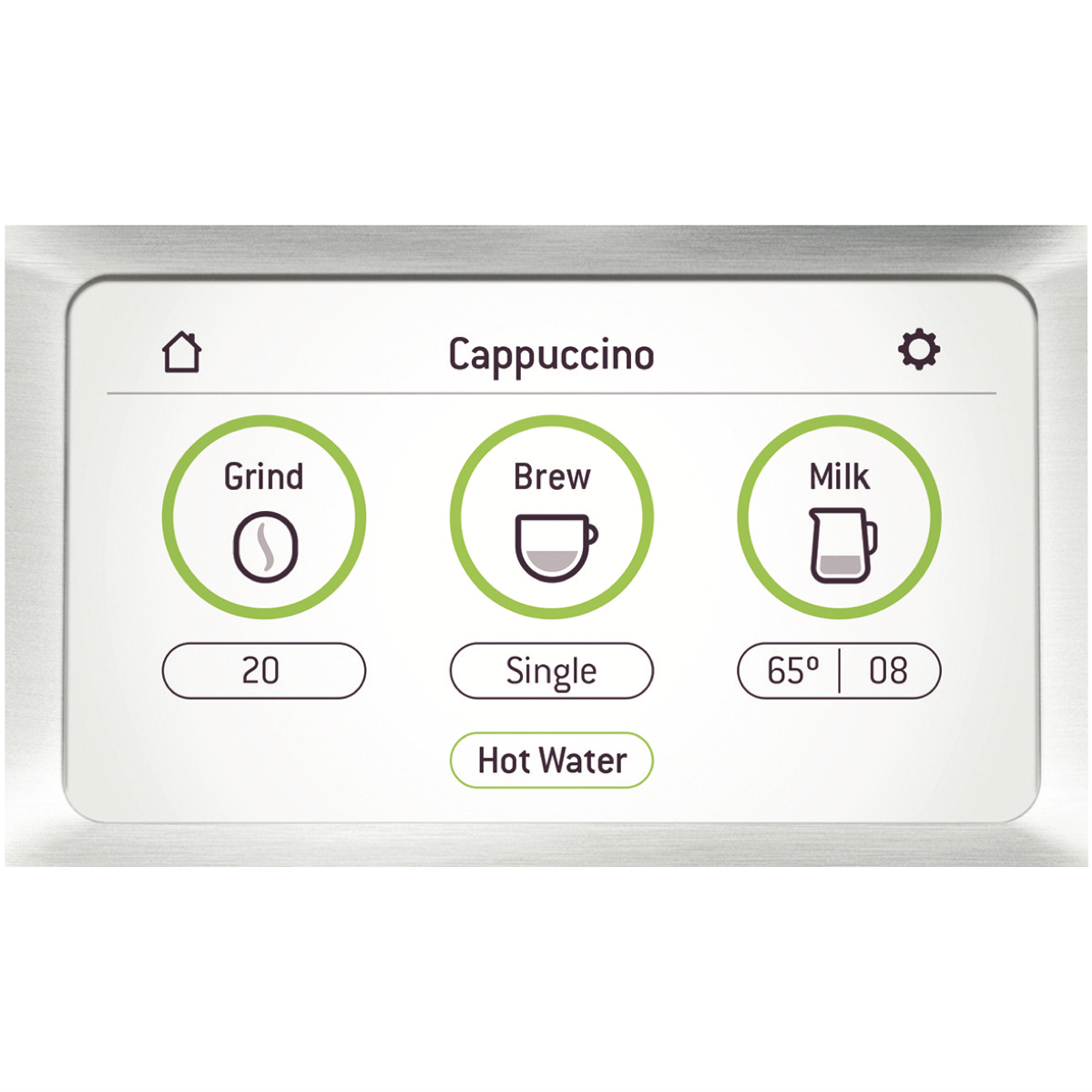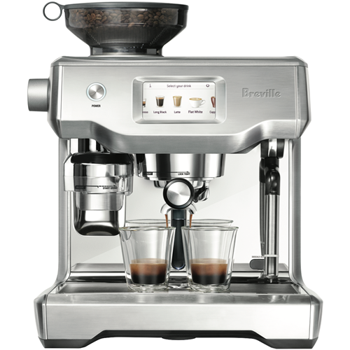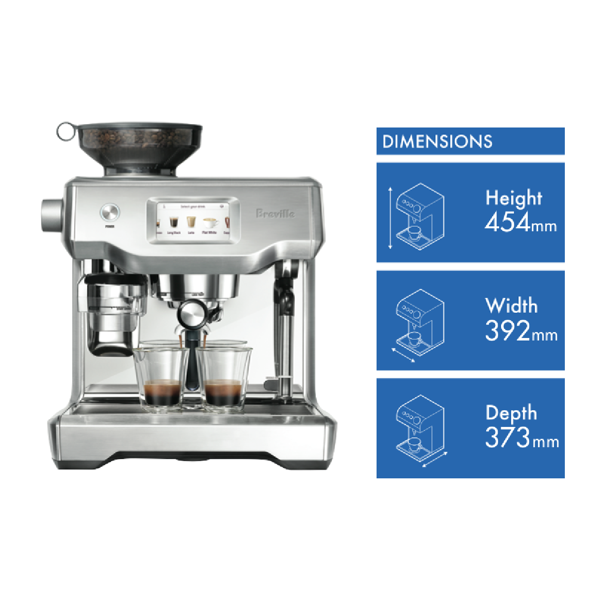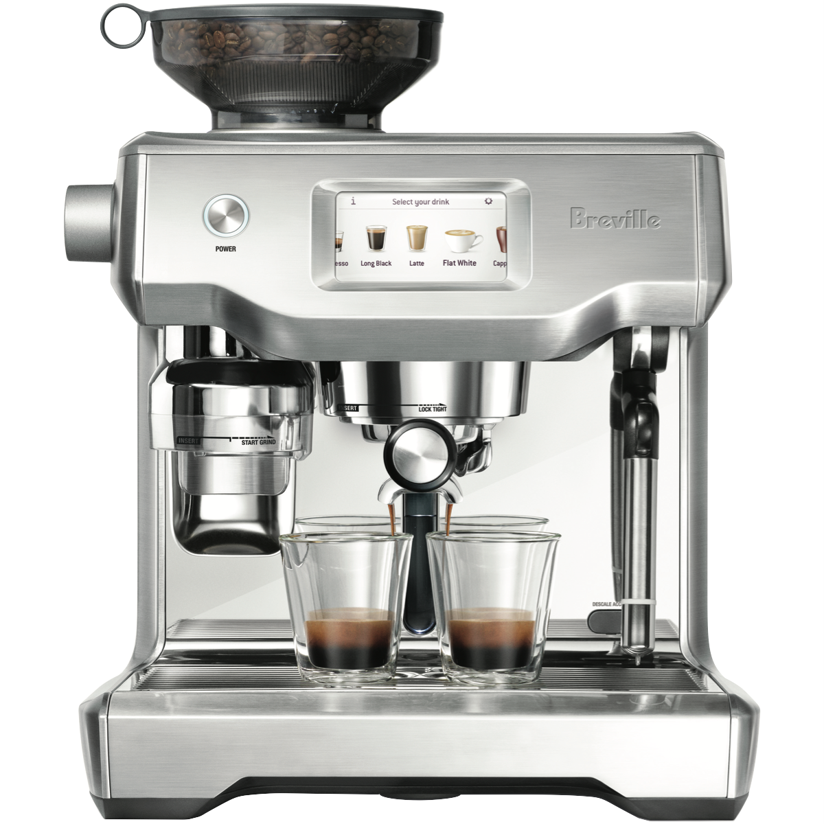 Discover barista-quality coffee in the comfort of your own home with the Breville The Oracle Touch. This fully automatic manual coffee machine effortlessly crafts cafe-style espresso and milk texturing with the touch of a button. The sleek stainless steel exterior houses an array of intelligent features designed to help you make coffeehouse beverages like a pro. With a powerful 2400W thermojet heating system 15 bar Italian pump and dedicated hot water outlet The Oracle Touch delivers optimal water temperature and pressure for extracting complex flavors and aromas from your favorite beans. The built-in conical burr grinder with adjustable grind control freshly grinds beans right before brewing for full-bodied taste. With fully customizable settings auto dosing tamping milk texturing and a 2.5L water tank capacity this machine takes the guesswork out of making espresso-based drinks. The easy-to-use touchscreen interface allows you to adjust grind size shot temperature milk texture and volume at the touch of a finger. Store up to 8 personalized coffee creations and take your skills to the next level. Bringing café quality coffee into the comfort of your home has never been easier. The manufacturer's part number for this product is BES990BSS. Explore the possibilities with The Oracle Touch today.