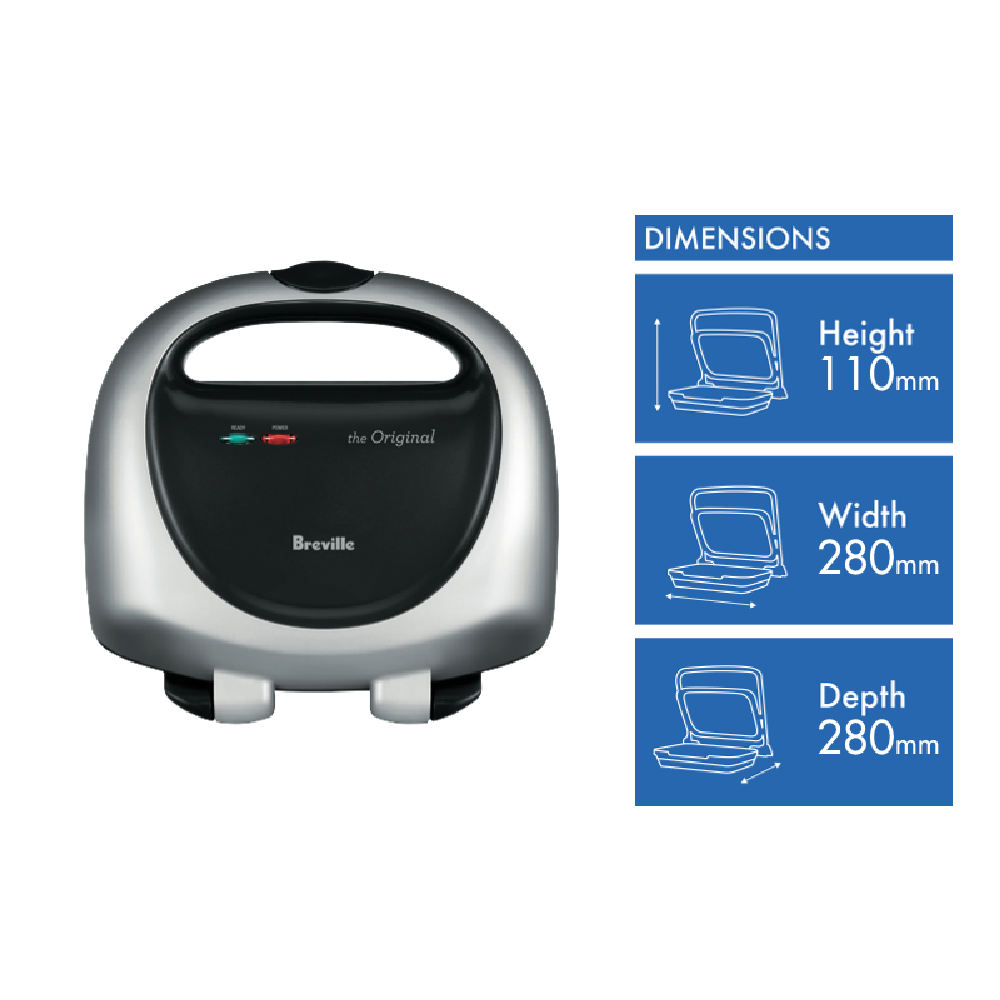 Bring home the taste of a classic Aussie brekkie with the Breville The Original Sandwich Maker. This 1000W jaffle maker features a sleek black and silver design that looks great on any kitchen counter while standing upright for convenient storage. Its PFOA-free non-stick coating allows for easy cleaning while the scissor action seals and cuts your toastie in half for perfect golden-brown results every time. With an adjustable height control you can cater to different fillings and the integrated 'On' and 'Ready' indicator lights let you know when it's time for the first bite. Quickly make delicious toasted sandwiches for the whole family and enjoy dinnertime favourites like ravioli toasties too. From savoury to sweet this 2-slice sandwich press delivers fast even heating and delicious results. The manufacturer's part number for this product is BTS200SIL. Bring home the one and only Breville sandwich maker for quick weekday breakfasts and weekend brekkie cook-ups.