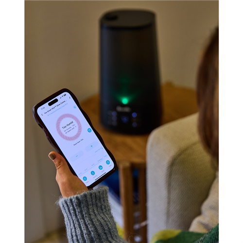 The humidifier boasts a 4L top-fill water tank for quick and easy refills a 12-hour timer and seven adjustable mist speeds for a personalisewd experiance. The SensAir System provides real-time humidity feedback while the empty tank alert with auto-off ensures safety and peace of mind. For added convenience the The Smart Mist Glow Connect includes a sleep mode that dims the control panel lights for uniterrupted reast as well as a mood light with 7 colour options to create a calming atmposhere. Plus an aromatherapy tray lets you enjoy your favourite essenital oils.