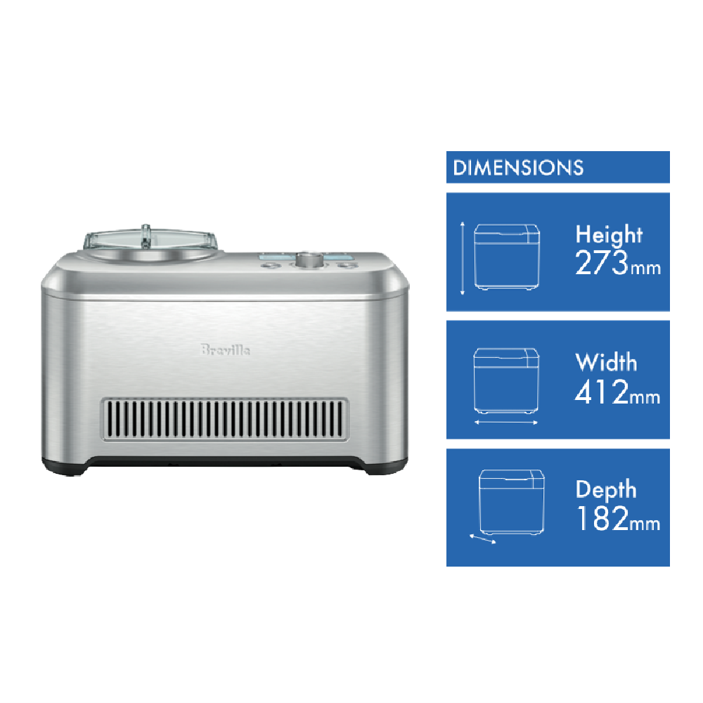 Make creamy decadent ice cream at home with the Breville The Smart Scoop Ice Cream Maker. This stainless steel ice cream machine allows you to craft 12 different textures from light airy sorbet to rich creamy gelato. With a generous 1 litre bowl capacity it's easy to churn multiple batches for the whole family. The automatic and manual settings provide full control over texture and hardness while the non-stick bowl surface makes serving a cinch. Keep your frozen desserts chilled for up to 3 hours until you're ready to indulge. The included accessories like the bowl paddle and cleaning brush ensure effortless operation and maintenance. With a sleek compact 412mm width and modern stainless steel finish this ice cream maker adds function and style to your kitchen benchtop. Craft your own gourmet ice creams and sorbets for a fun dessert activity the whole family will love. The manufacturer's part number for this product is BCI600. Check out the Breville The Smart Scoop Ice Cream Maker today.