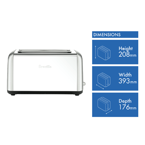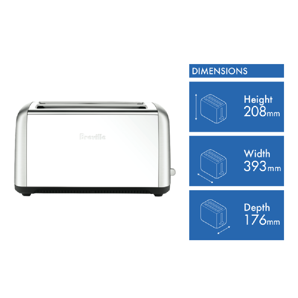 Enjoy perfectly toasted bread every time with the Breville The Toast Control 4 Slice Toaster. This sleek brushed stainless steel toaster not only looks great on your kitchen counter but it also delivers outstanding performance and versatility. With its unique 'Fruit Bread & Frozen' setting you can achieve ideal results when toasting thicker slices or frozen breads. The innovative 'A Bit More' button allows you to add a little extra toasting time for those who like their toast a bit darker without starting the entire cycle over. This 1800 watt toaster also features a manual lift and look function so you can check your toast mid-cycle. The extra wide and deep self-centering slots easily accommodate regular or extra large artisan bread slices. Additional highlights include a removable crumb tray for easy cleaning and a cord storage system to keep your countertop clutter free. With a 12 month manufacturer's warranty you can trust this Breville toaster will provide delicious golden brown toast for years to come. The manufacturer's part number for this product is LTA650BSS. Bring home the perfect toast with the Breville 4 Slice Toaster today.