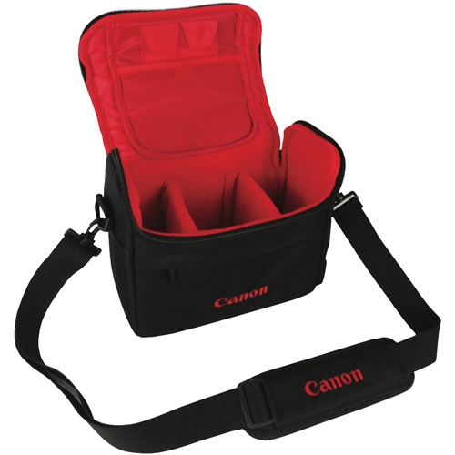 Transport your Canon camera in style with this sleek black shoulder bag. The Deluxe Bag provides ample padded storage for a DSLR body and lenses keeping your gear protected on the move. Its durable exterior withstands the rigors of travel while the bold red interior adds a pop of color whenever you access your equipment. With dimensions of 235mm x 145mm x 260mm the bag offers plenty of room for a camera body and 2-3 lenses up to 70-200mm f/2.8 size. Twin padded dividers allow you to customize the main compartment to suit your kit. An additional zippered front pocket stores small accessories like batteries and memory cards. Top carry handles and an adjustable shoulder strap provide convenient carrying options. The manufacturer's part number for this product is SLRBAGII. See our range of camera bags to find the perfect fit for your photography gear.