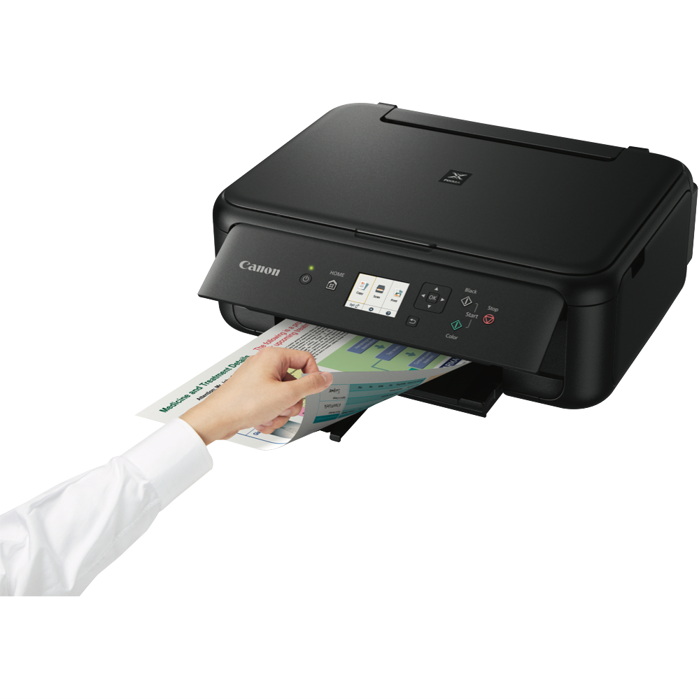 Achieve convenient wireless printing at home with the Canon PIXMA TS5160BK Inkjet Multifunction Printer. This versatile all-in-one lets you print scan and copy documents and photos with ease. Equipped with built-in Wi-Fi you can print from laptops smartphones and tablets wirelessly. It uses individual PG-640 black and CL641 colour ink cartridges to deliver lab-quality photos and sharp text. You'll achieve print speeds of up to 13ipm in black and 6.8ipm in colour. Scan and copy at up to 1200 x 2400dpi for crisp clarity. Compatible with AirPrint and Google Print for flexible mobile printing. Paper handling is flexible with the 100 sheet tray supporting sizes from A4 to envelopes and 4x6in photo paper. Measuring just 425mm wide this compact printer is easy to fit on your desk at home or in a small office. The PIXMA TS5160BK comes complete with Canon's 1 year warranty for added peace of mind. The manufacturer's part number for this product is TS5160BK. For easy wireless printing at home consider the Canon PIXMA TS5160BK today.