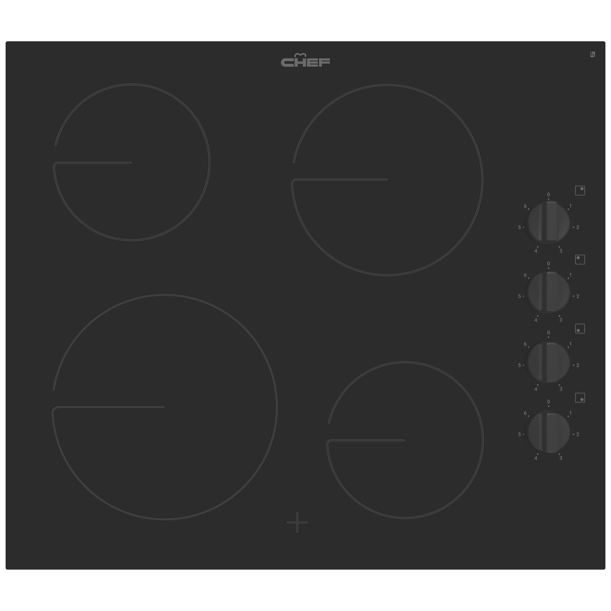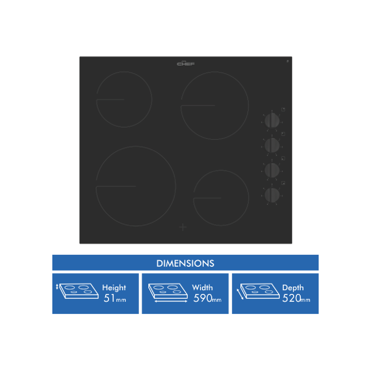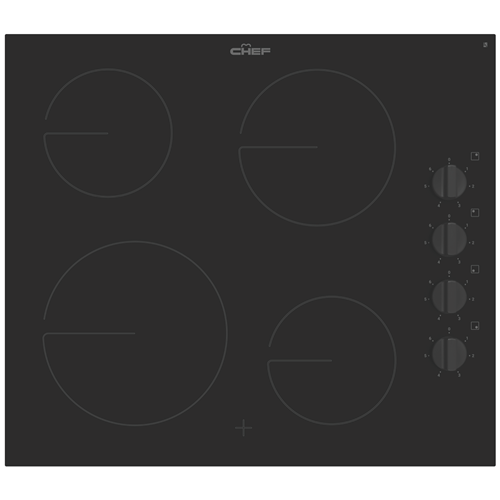 The timeless black ceramic glass surface and black control knobs of this Chef 60cm Ceramic Cooktop CHC642BB keep your kitchen forever on trend. Four cooking zones with controls to the side offer maximum cooking space and quick and effortless changes to the heat intensity at any given time. Whip up sizzling stir-fry creations on the powerful 2.3kW zone as accompanying dishes simmer or boil to the side. Hot surface indicators let you know when the surface is still too hot to touch after cooking. Cleaning this Chef cooktop is a breeze thanks to the smooth glass surface that can be simply wiped down with a damp cloth when it's safe to do so.