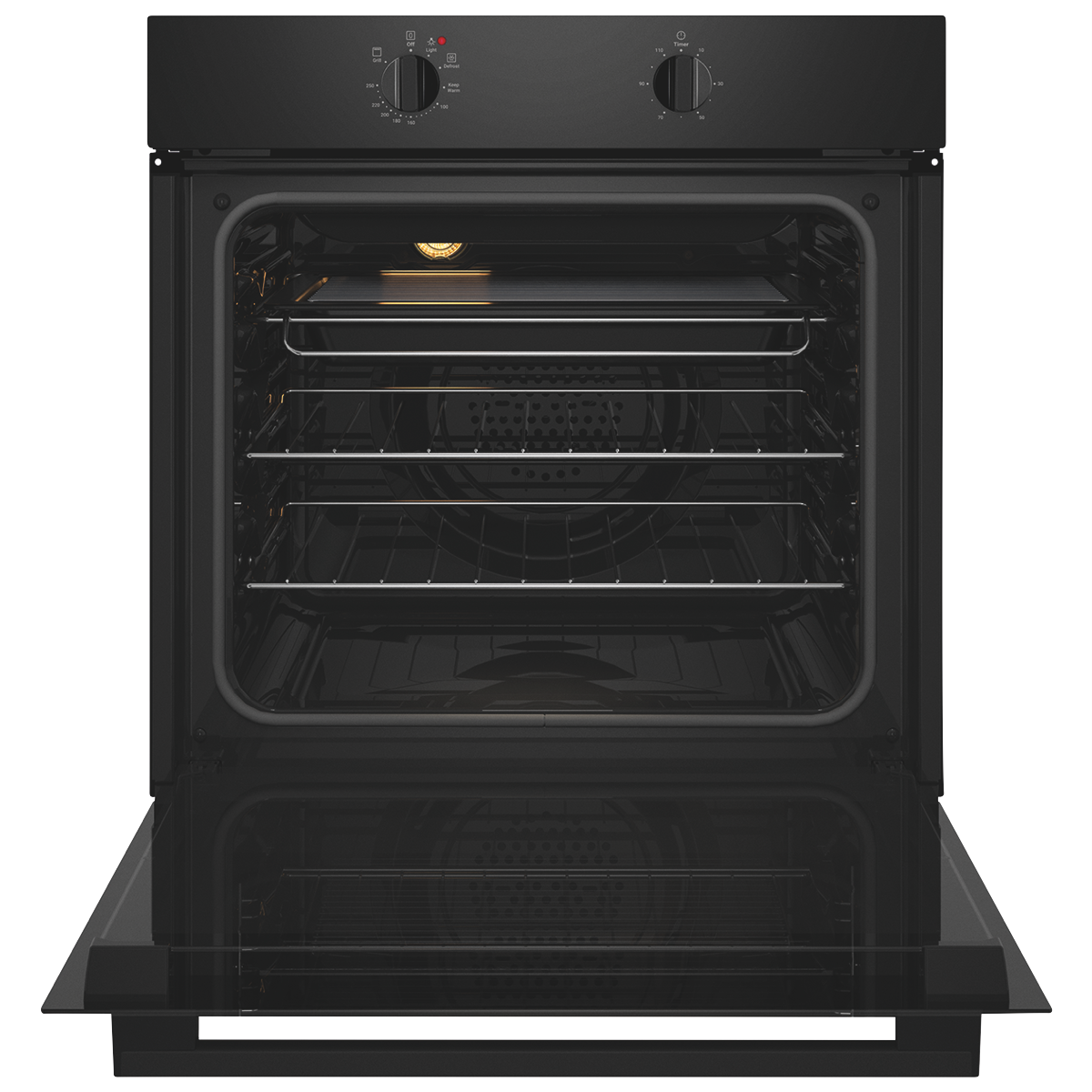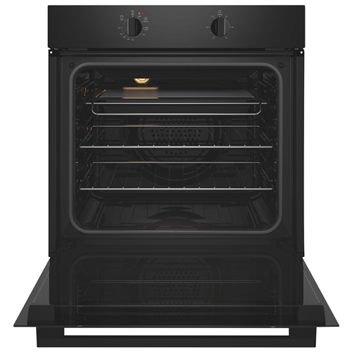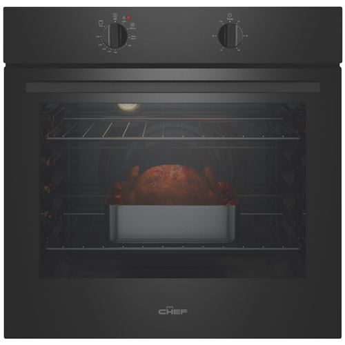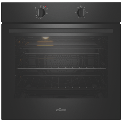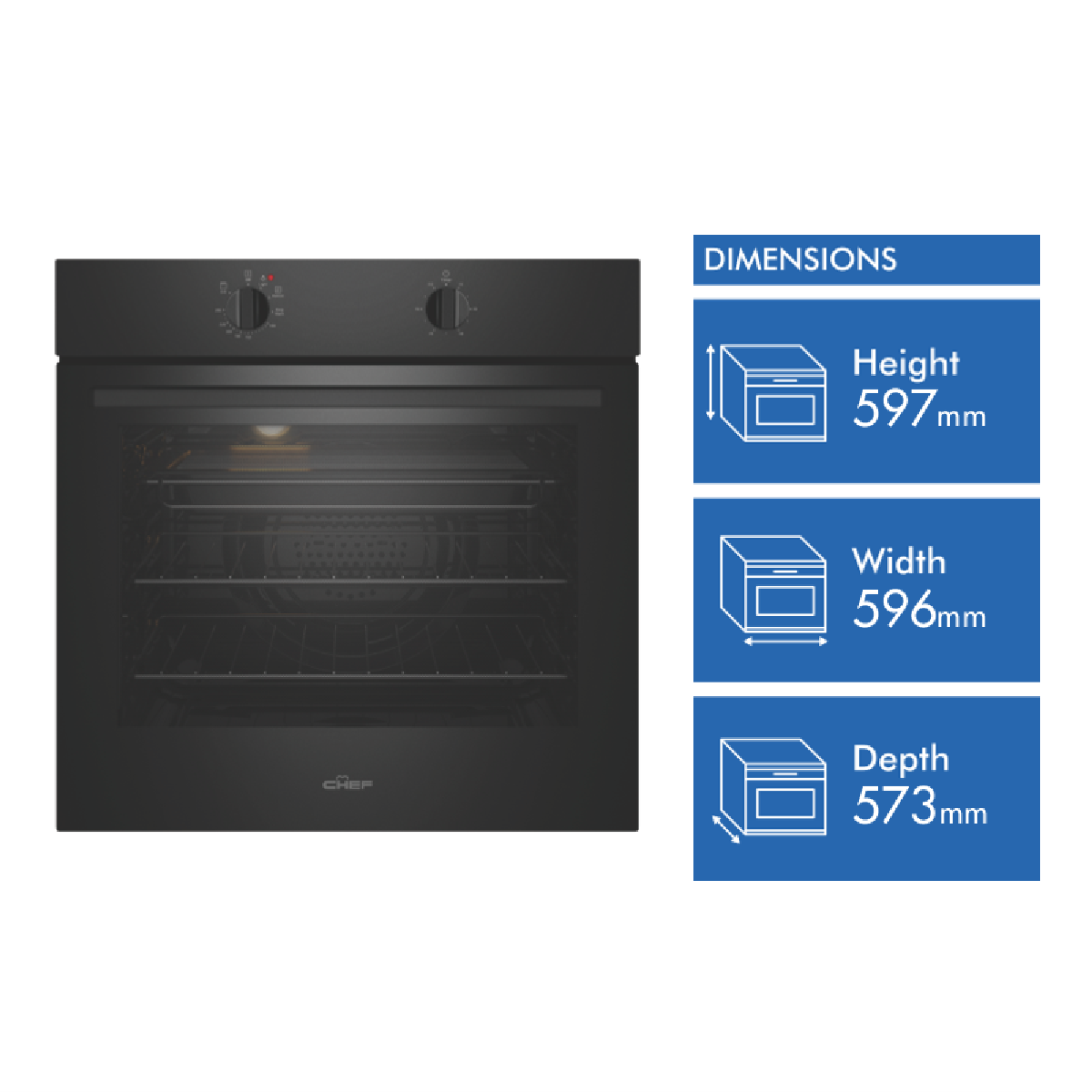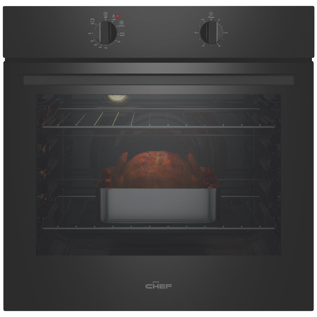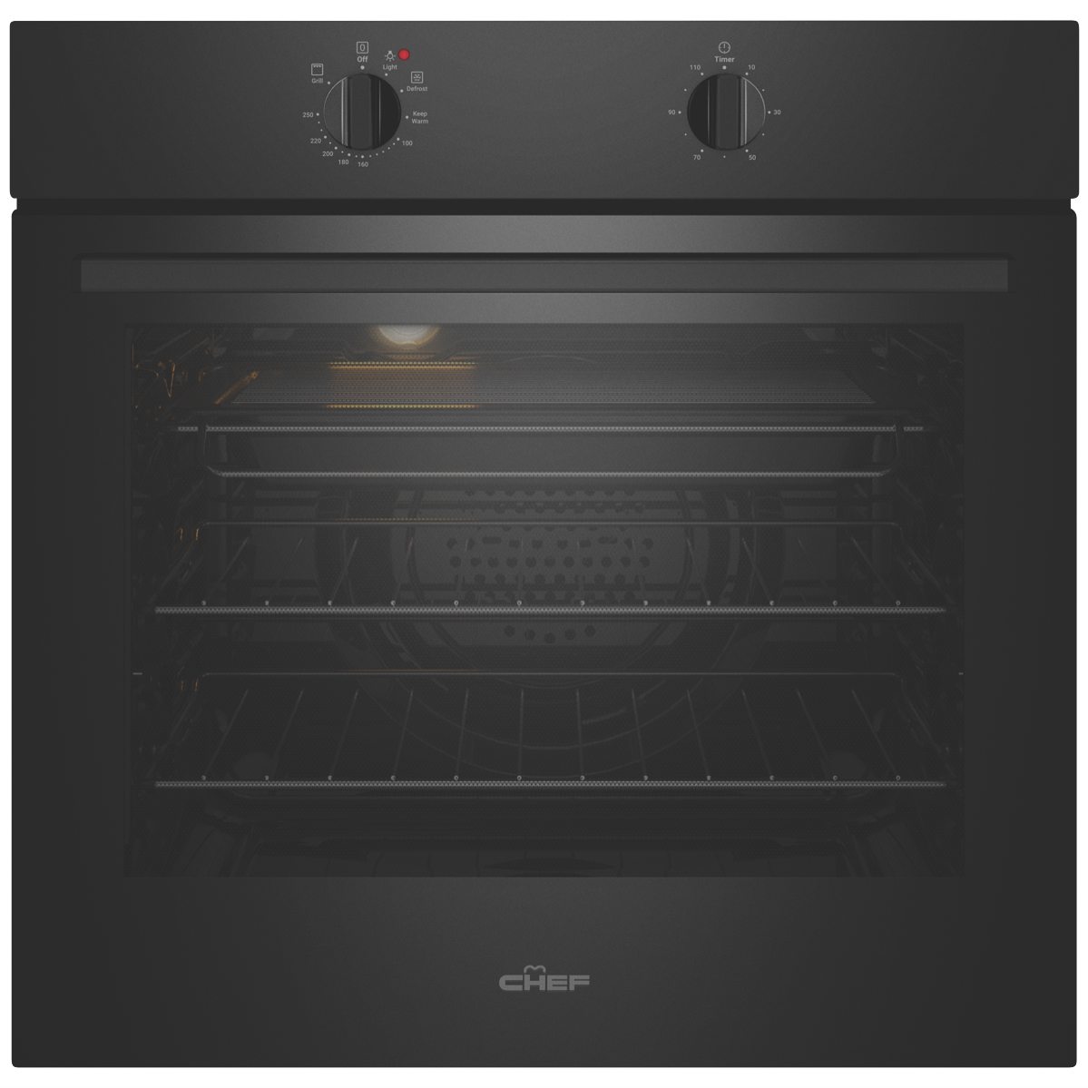 The easy-to-use Chef 60cm Electric Oven Black CVE612DB makes cooking fuss-free and uncomplicated while keeping your kitchen stylishly on trend with its pure matte black design and dark glass door. Cooking flexibility is yours with a 72-litre useable capacity oven cavity with up to five shelf positions to place food on the right level for optimal cooking results. Make a generous roast dinner or bake delicious pastries using Fan Bake or select Grill for wholesome veggie or chicken skewers. Conveniently thaw out frozen foods using the low temperature setting of the Defrost function. Two straightforward dial controls offer fast and easy heat and cooking time selection - select the programmable timer to set the cooking start time and duration when precision matters. Featuring removable inner glass panes for thorough cleaning and a cool door to minimise the heat on the outside this user-friendly Chef oven makes your time in the kitchen simple and enjoyable.