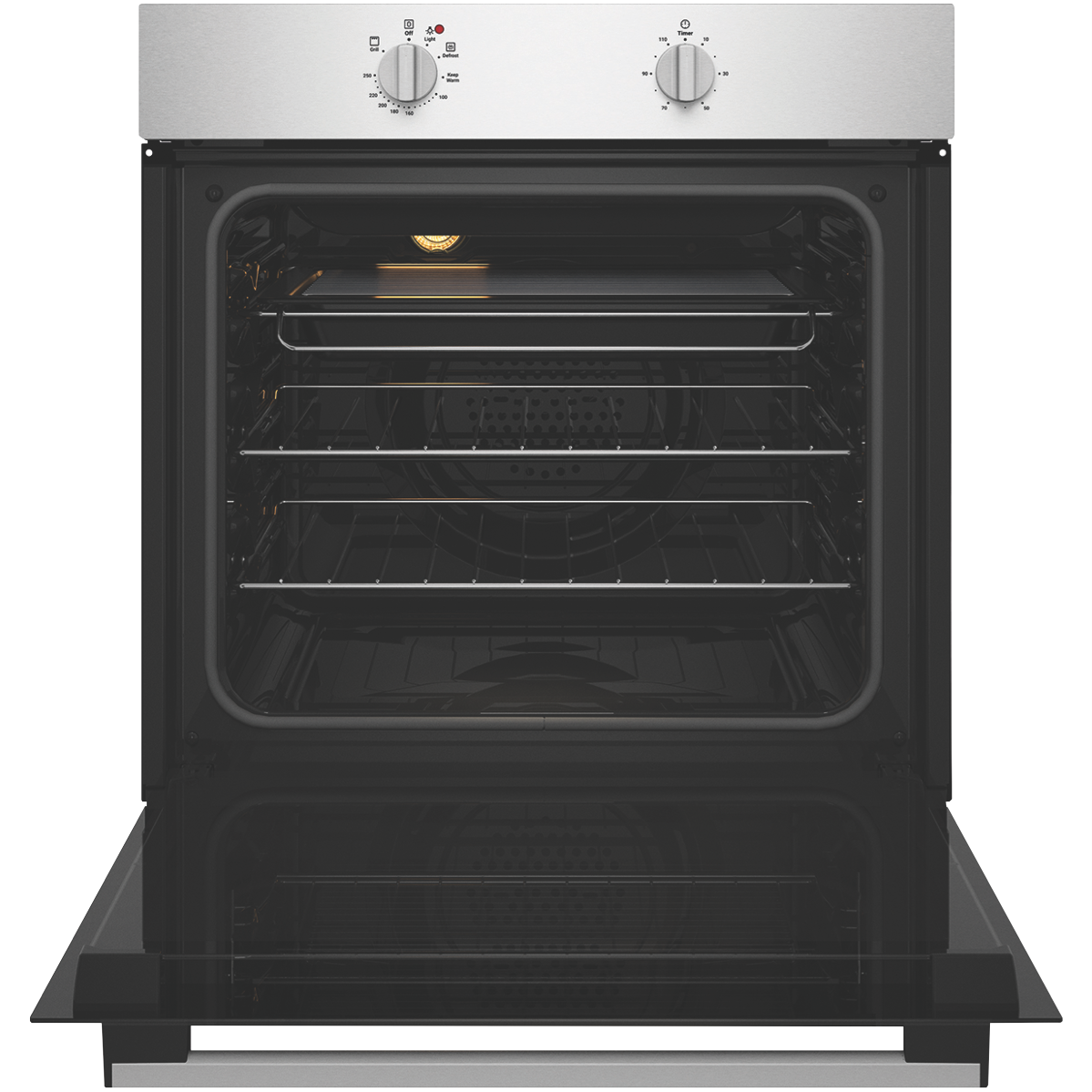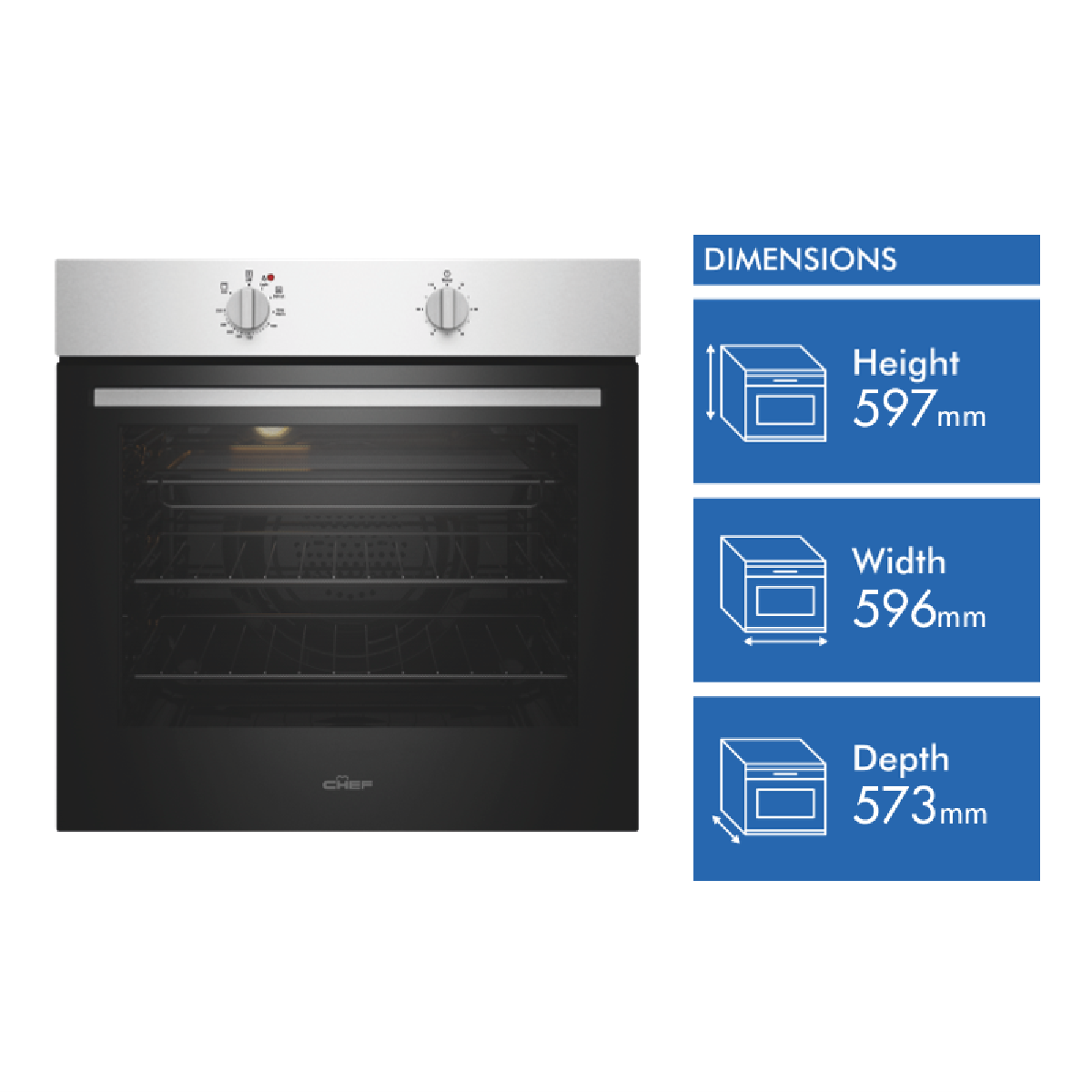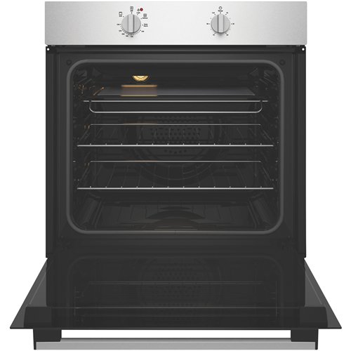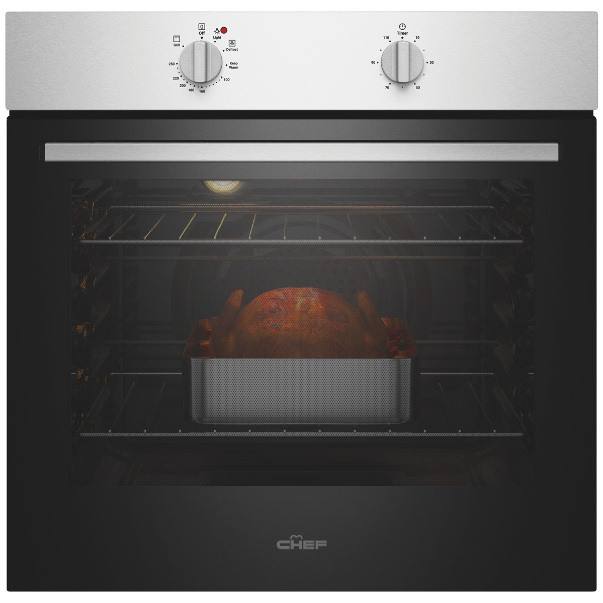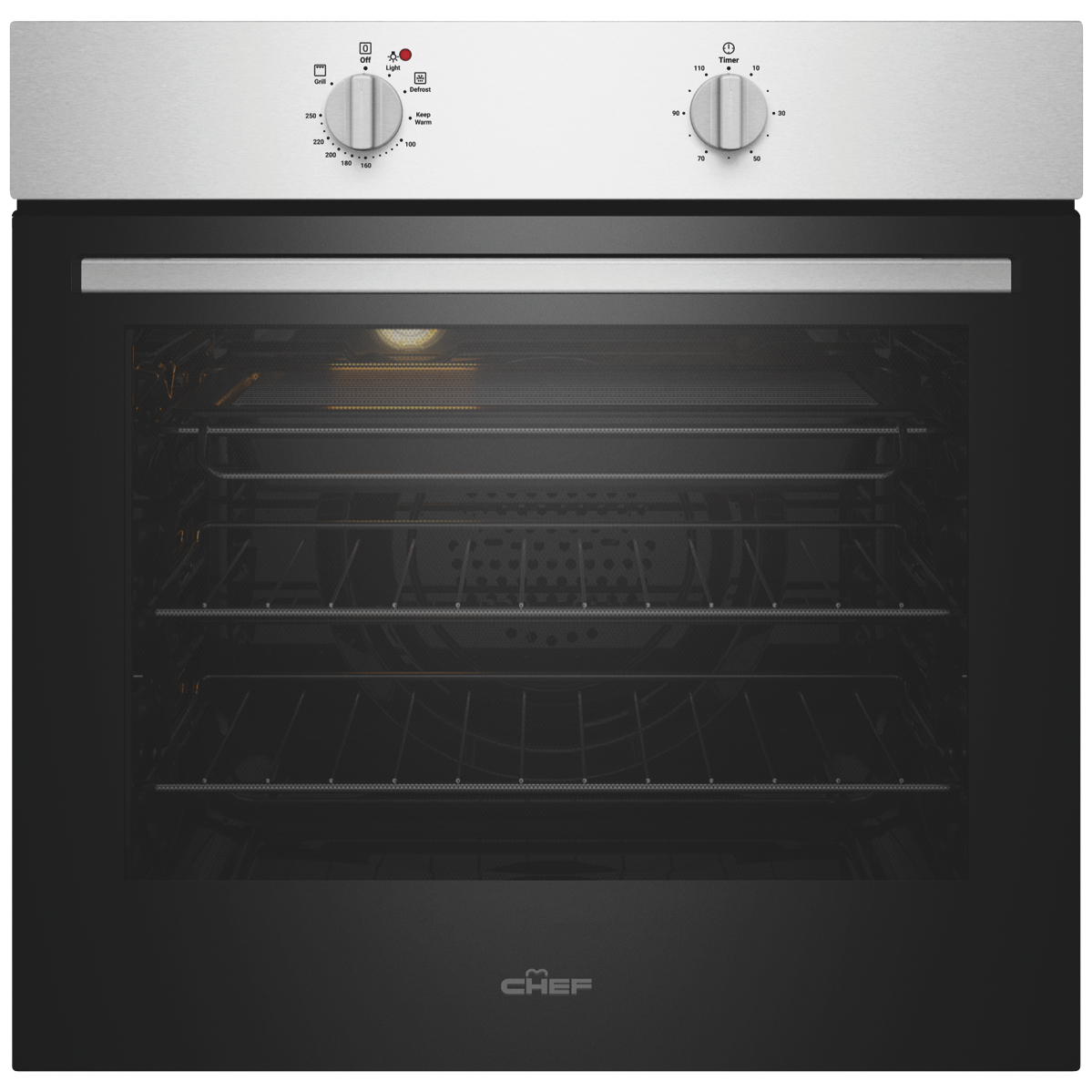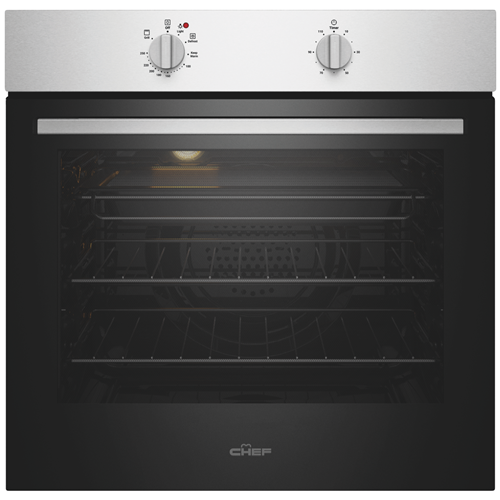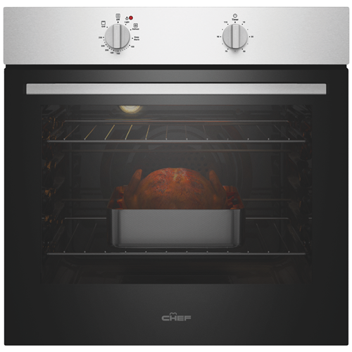 The easy-to-use Chef 60cm Electric Oven Stainless Steel CVE612SB makes cooking fuss-free and uncomplicated while keeping your kitchen stylishly on trend with its clean lines and dark glass door. Cooking flexibility is yours with a 72-litre useable capacity oven cavity with up to five shelf positions to place food on the right level for optimal cooking results. Make a generous roast dinner or bake delicious pastries using Fan Bake or select Grill for wholesome veggie or chicken skewers. Conveniently thaw out frozen foods using the low temperature setting of the Defrost function. Two straightforward dial controls offer fast and easy heat and cooking time selection - select the programmable timer to set the cooking start time and duration when precision matters. Featuring removable inner glass panes for thorough cleaning and a cool door to minimise the heat on the outside this user-friendly Chef oven makes your time in the kitchen simple and enjoyable.