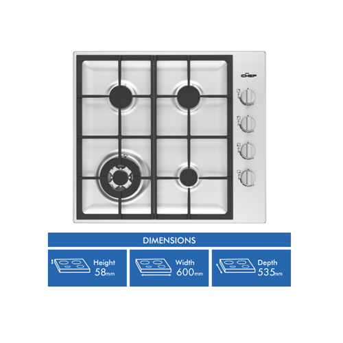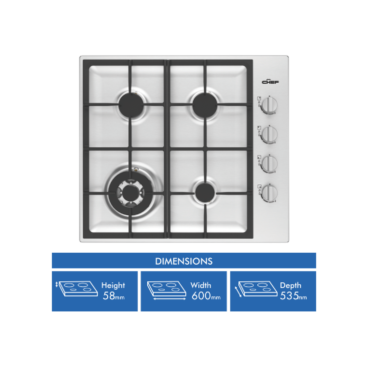 This Chef 60cm Gas Cooktop Stainless Steel CHG644SC has a high-powered wok burner so you can achieve the required intensity for delicious stir fry at home. Controls are positioned to the side for safety; eliminating the need to reach over hot pots and pans whilst offering quick and easy changes to the heat intensity at any given time. Experience one-push start ignition every cook. Plus Chef's cast iron trivets keep your pots and pans stable as well as allowing for ease of movement between burners.