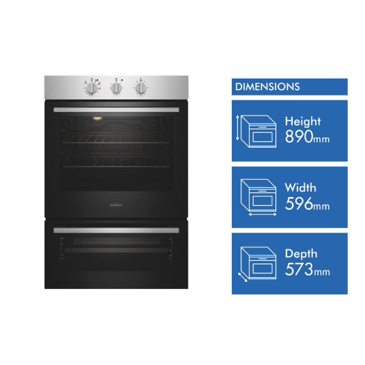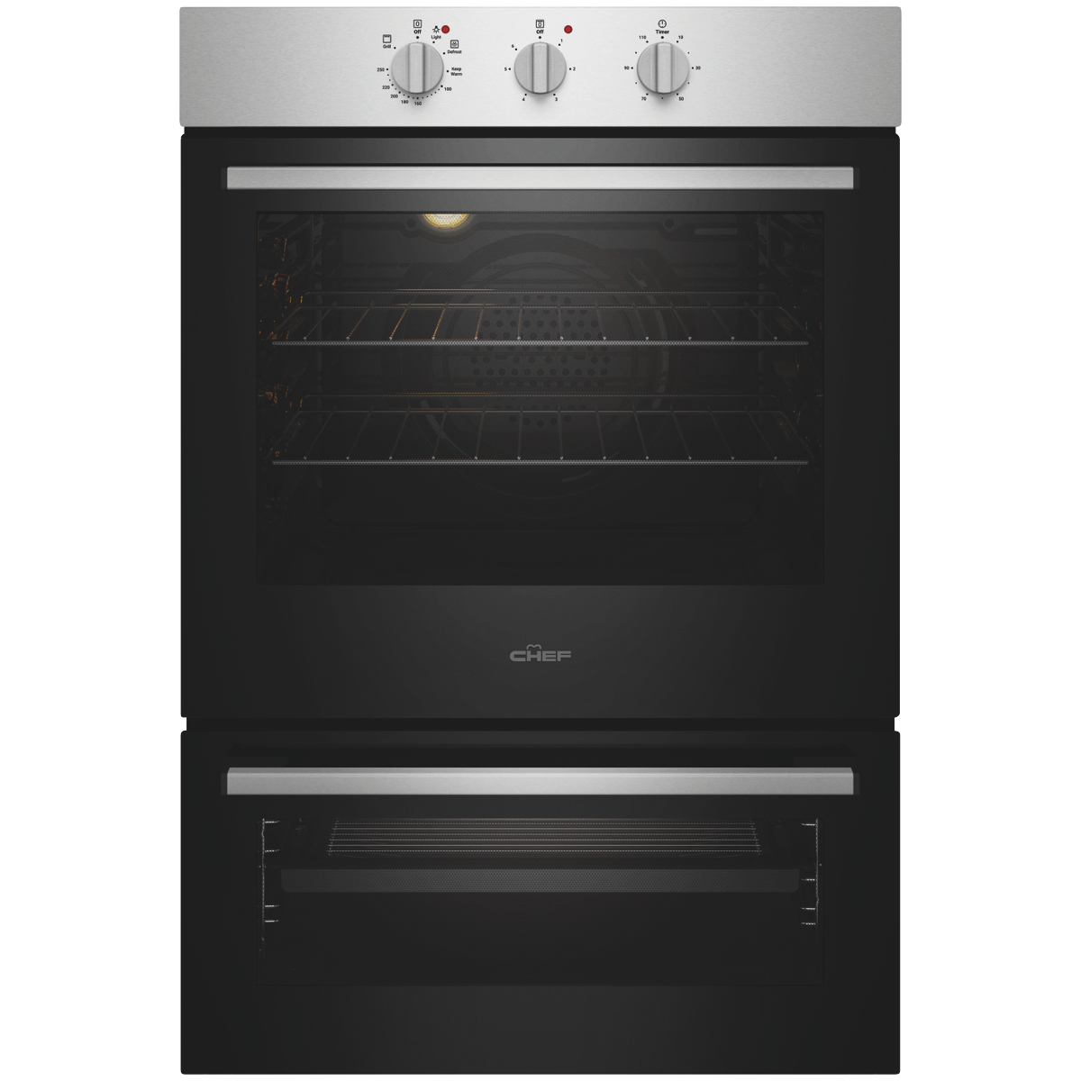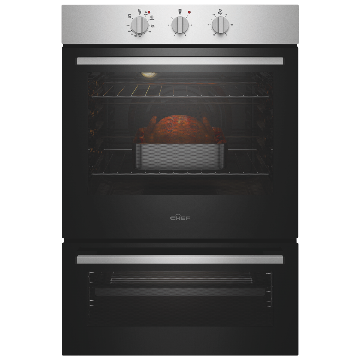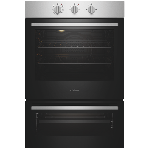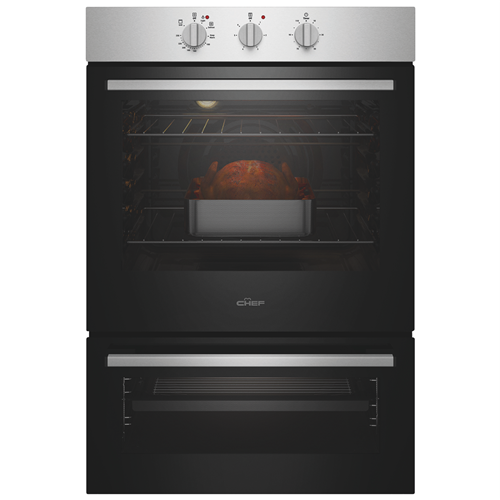 Cook multiple dishes at once with this user-friendly Chef 60cm Double Oven Stainless Steel CVE662SB with its 110-litre useable capacity combined and fuss-free operation. Make a generous roast dinner or bake delicious pastries in the main oven using the Fan Bake setting as veggie or meat skewers brown up nicely in the separate grill below. Plus you can conveniently thaw out frozen foods in the main oven using the low temperature setting of the Defrost function. This Chef oven has straightforward and individual dial controls for operating the oven separate grill and the programmable timer for fast and easy selection of desired settings. The clean lines and black glass door make this a stylish addition to any kitchen space while removable inner glass panes allow for convenient cleaning. Make your time in the kitchen simple and enjoyable with this Chef double oven.
