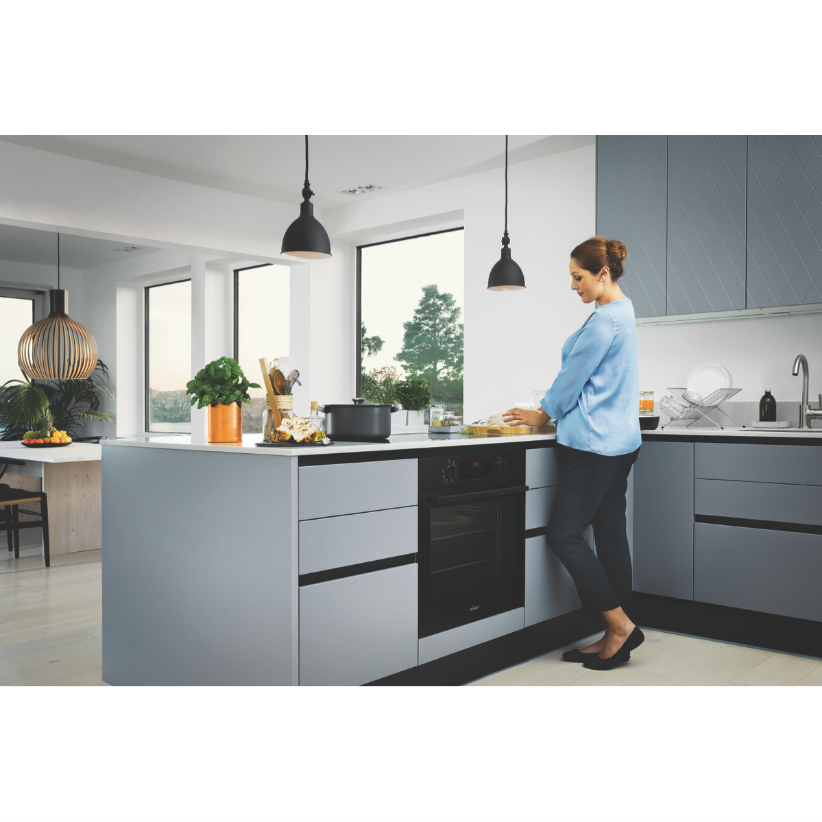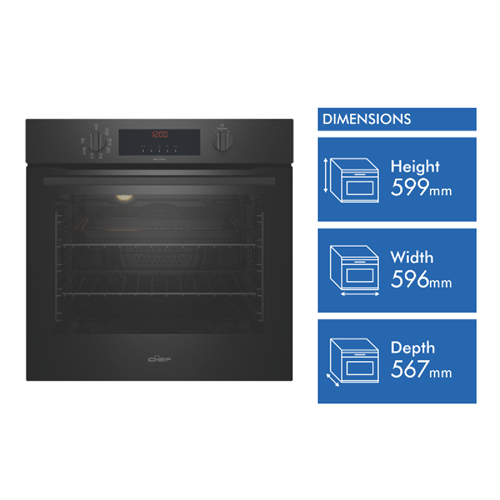The Chef 60cm Pyrolytic Oven Black CVEP614DB makes both cooking and cleaning quick and easy while keeping your kitchen stylishly on trend with its pure matte black finish and dark glass door. Pyrolytic technology makes this a self-cleaning oven - simply turn the dial to 'Pyro' and the oven reaches high temperatures to turn residue into ash for a quick wipe once the cavity has cooled down. Cooking flexibility is yours with a 72-litre gross capacity oven and seven functions including 'Fan Bake' for cooking meals on multiple levels or 'Quick Cook' for rapid and even heat for speedy roast dinners or for cooking pre-cooked foods straight from the freezer - think meat pies or savoury pastries when there's no time to meal prep. Starting the oven is simple with just two control knobs to operate: select a cooking function at the left oven function selector followed by the temperature at the far-right oven thermostat control. Operate the middle timer to set the cooking start time and duration when precision matters. Get dinner on the table fast and perfect a thorough clean without fuss thanks to the Chef pyrolytic oven making your time in the kitchen simple and enjoyable.
