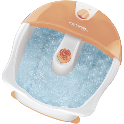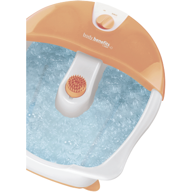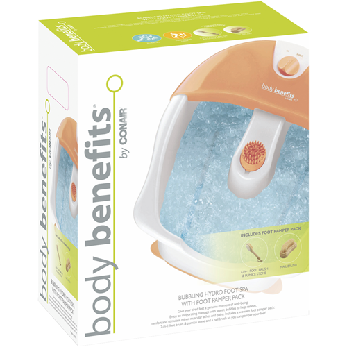 Treat your feet to a relaxing and invigorating home spa experience with the Conair Bubbling Hydro Foot Spa and Pamper Pack. This foot spa features aeration jets that release millions of bubbles for a soothing massage that helps improve circulation. Massage tips stimulate the soles of your feet while the arched pedicure massager gently scrubs away calluses for smooth soft skin. Maintaining heat for extra comfort the extra-deep basin allows you to immerse your feet completely during use. The convenient splash guard contains splashes for mess-free massaging. Pamper your feet even further with the included foot file brush pumice stone and nail brush. Bring the luxury of a spa to your home with this foot spa that provides an invigorating hydro massage. CFB5TA is the manufacturer's part number of this product. Start relaxing and rejuvenating your feet today with this soothing foot spa.
