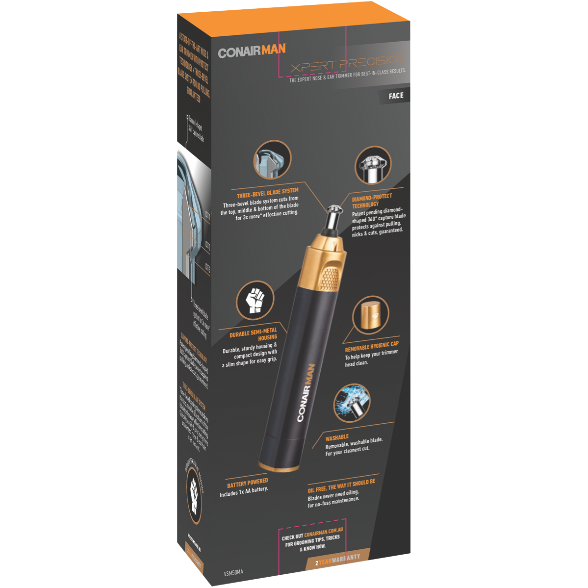 Achieve precise grooming with the ConairMan The Xpert Precision body trimmer. This battery-powered trimmer features Diamond Protect Technology and a three-bevel blade system for smooth comfortable trimming. The durable compact design includes a semi-metal housing and hygienic cap to keep things clean. With multiple attachments and alkaline or lithium battery compatibility you can trim and detail your body hair with precision. The washable attachment head makes cleaning a breeze. Showcase your style with this versatile portable trimmer. ConairMan's precision trimmer brings salon-quality grooming home. The manufacturer's part number for this product is VSM50MA. Add this innovative trimmer to your grooming kit today.