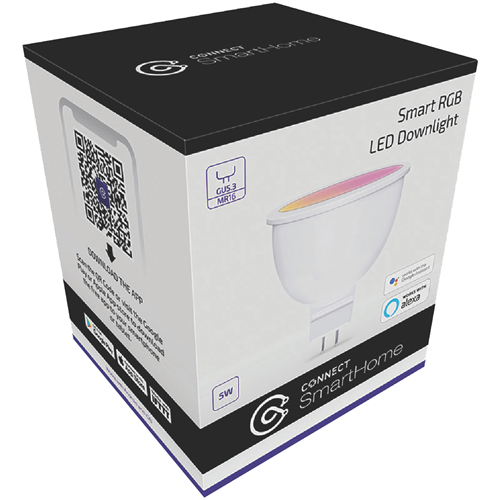 Light up your home in a spectrum of vibrant colours with the Connect SmartHome Smart 5W RGB Downlight. This smart bulb allows you to set the perfect ambience whether you're after a cosy candlelight glow crisp bright light to illuminate a workspace or a dazzling rainbow effect for parties. Controlled via the user-friendly Connect SmartHome app you can choose from 16 million colours and shades of white as well as dim and brighten as needed. Built to last with an impressive 25000 hour lifetime this downlight bulb delivers energy-efficient performance at just 5W. Measuring 85mm in height and 90mm in width the compact bulb fits most standard downlight fittings. It works with both Amazon Alexa and the Google Assistant so you can control your lighting with voice commands. Bring voice-activated smart lighting to your home with the Connect SmartHome RGB downlight today. The manufacturer's part number for this product is CSH-GU53RGB5W.