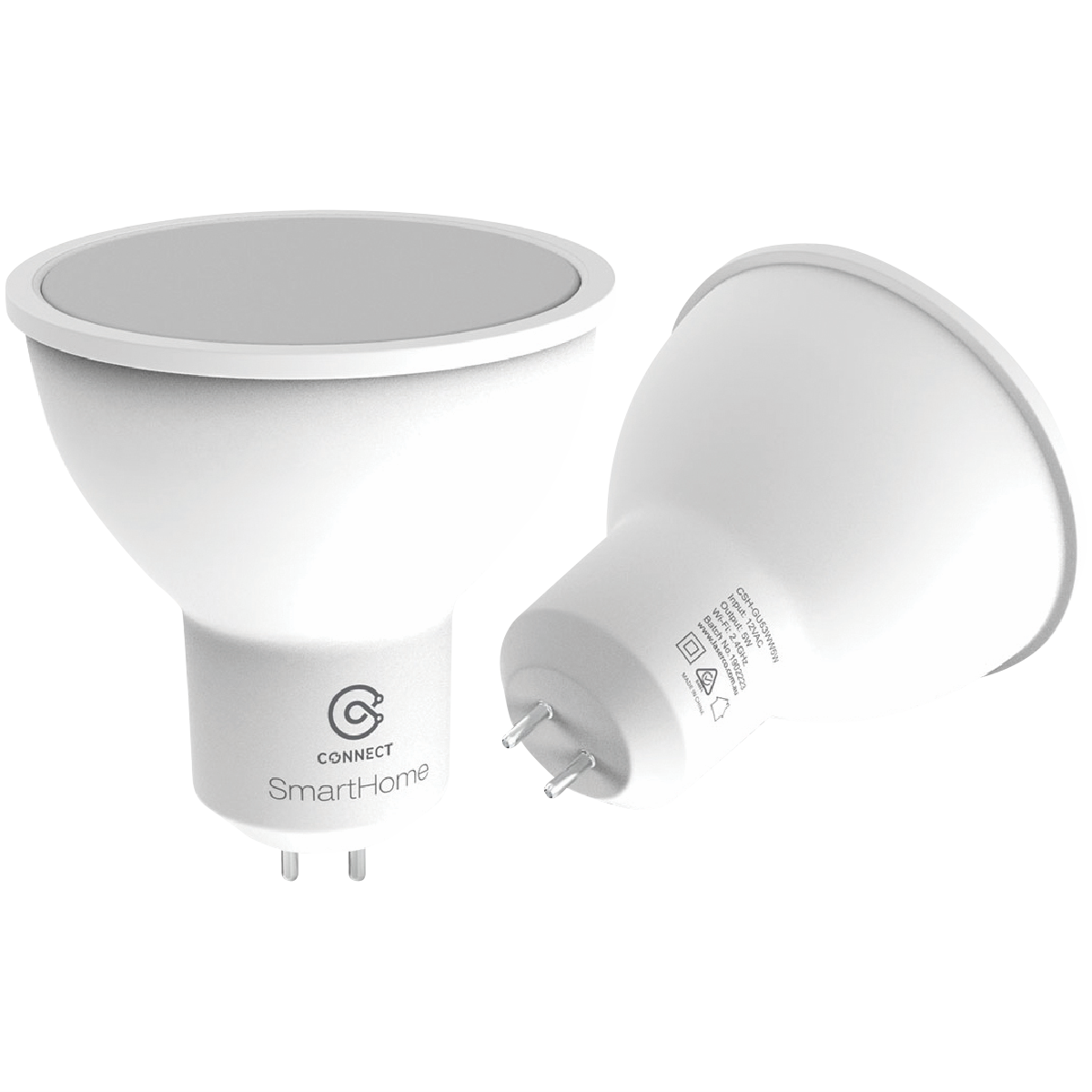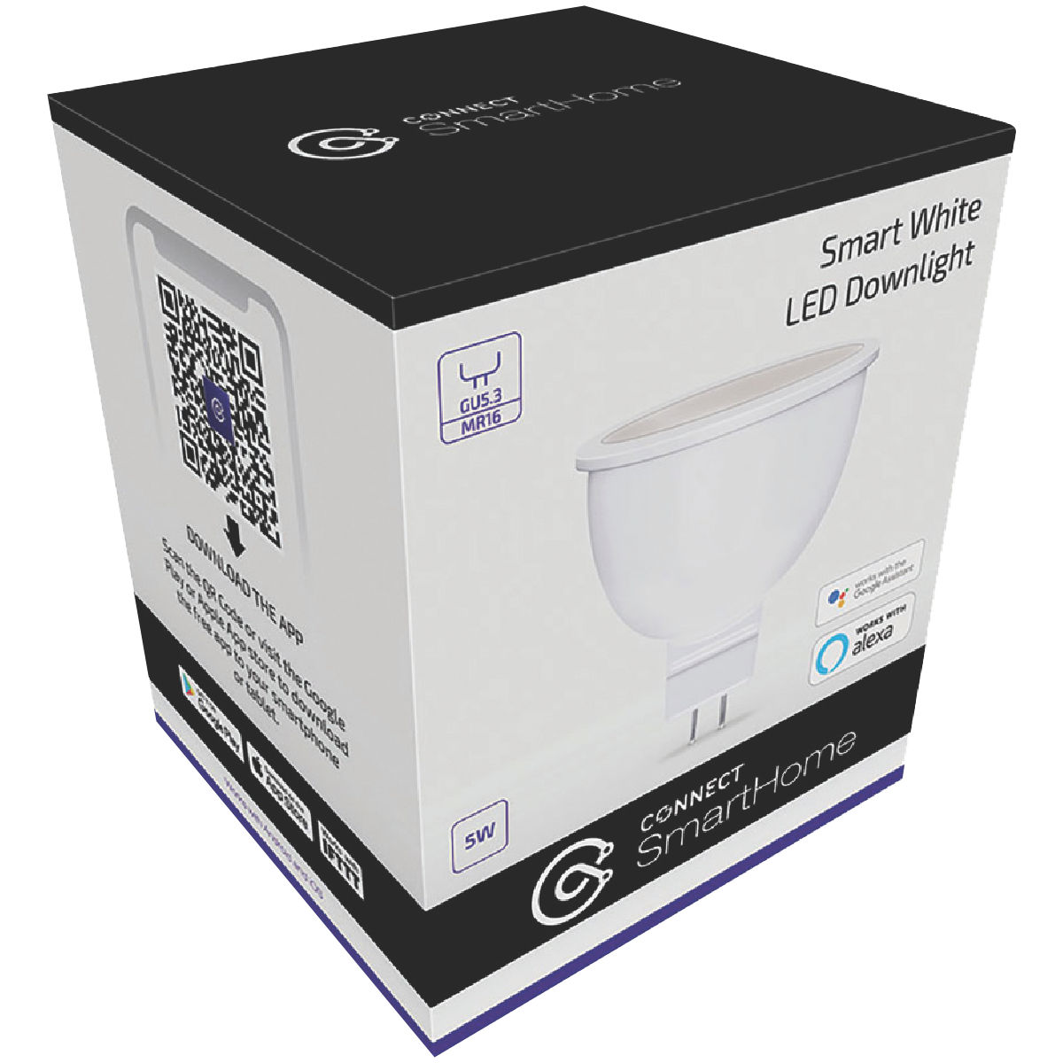Illuminate your home with the Connect SmartHome Smart 5W White Downlight. This smart bulb seamlessly integrates into your existing downlights to provide warm white light. With a brightness of 460 lumens it lights up any room. Control your lighting from anywhere using the Connect SmartHome app. Set schedules timers and adjust brightness levels to suit your needs whether you're home or away. Voice control compatible with Alexa and Google Assistant enabled devices. Create customized scenes and control multiple lights with a simple voice command. Built to last with an impressive 25000 hour lifetime. No need to climb ladders for bulb changes. This downlight uses just 5 watts of power for energy efficient illumination. The slim 80g design at 85mm high x 90mm wide x 105mm deep blends into any décor. Covered by a 1 year manufacturer's warranty for peace of mind. The manufacturer's part number for this product is CSH-GU53WW5W. Bring effortless smart lighting to your home with the Connect SmartHome Downlight today.