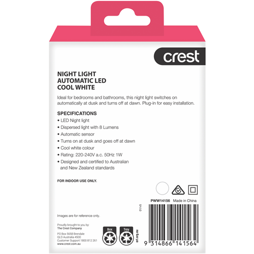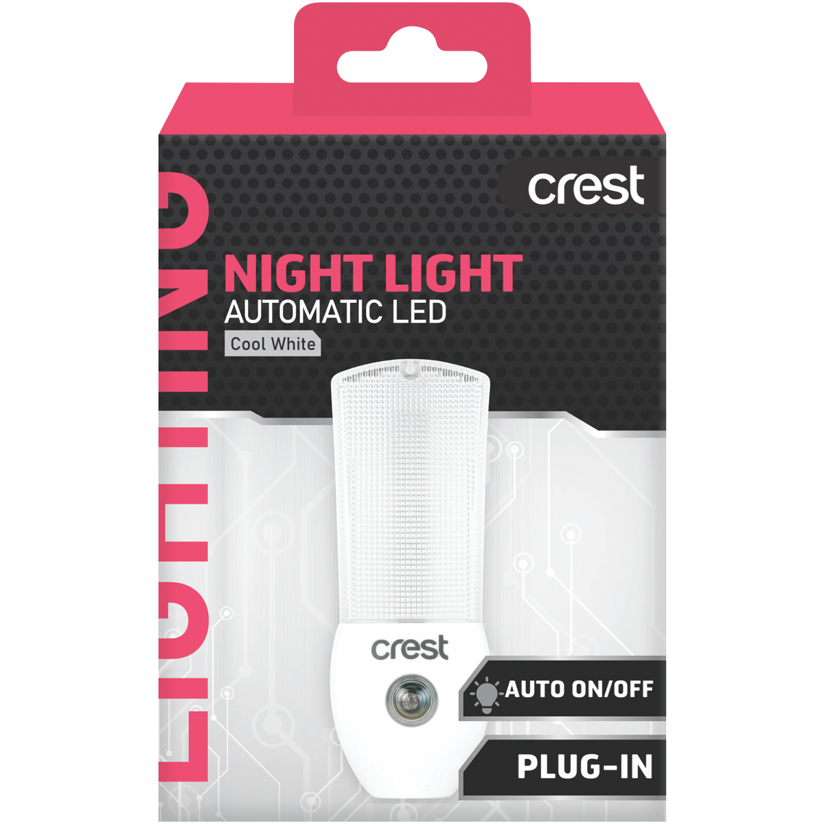Brighten up your night with the Crest Automatic Night Light. This handy little light turns on automatically when it gets dark providing a soft comforting glow. No more fumbling for the light switch or stumbling in the dark. With a 1-year manufacturer's warranty you can trust in the quality and durability of this night light. The Crest Automatic Night Light model PWW14156 is the perfect addition to any bedroom hallway or bathroom.