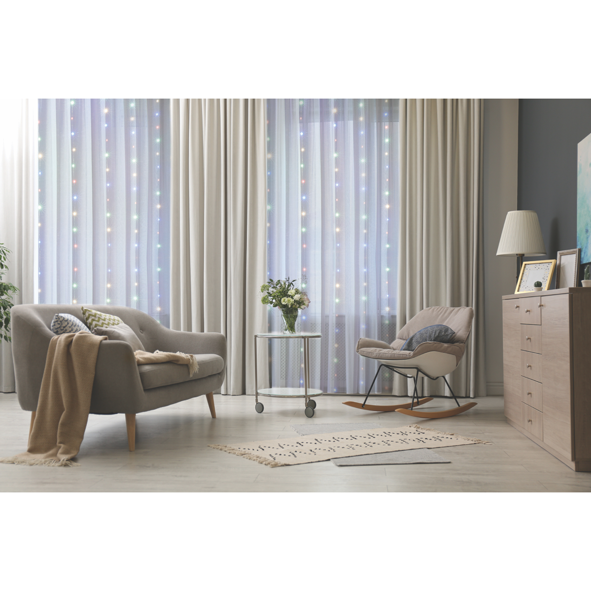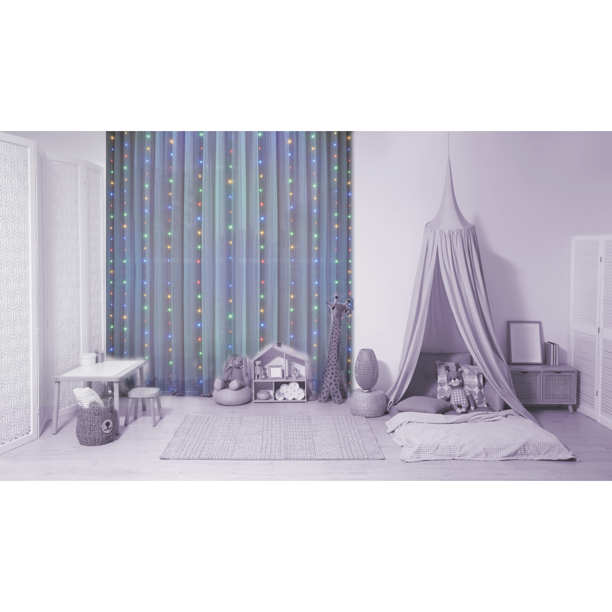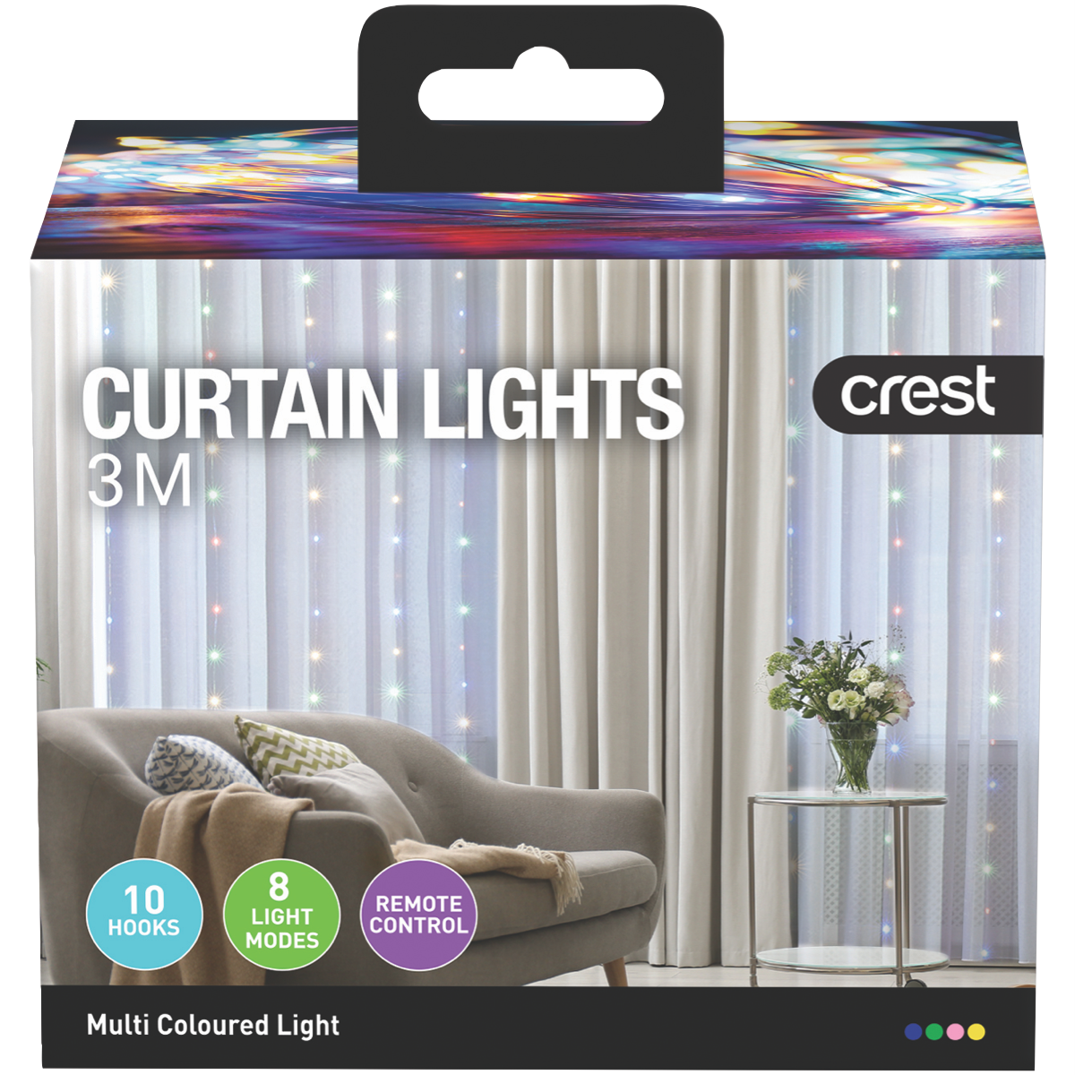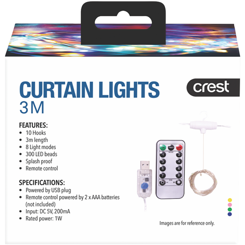 Illuminate your next party or gathering with the Crest Curtain Party Lights. This decorative LED light string powered by a USB plug and remote control adds a vibrant pop of color and light to any space. The remote allows you to easily switch between 8 different lighting modes to set the perfect mood. Drape these energy-efficient lights along your patio over a doorway or window or across your living room. The flexible ribbon design means you can get creative and use them just about anywhere. With 1W power output these lights are bright enough to make a statement but not overpowering. They're completely safe for indoor and outdoor use. Made to last through countless celebrations for years to come the Crest Curtain Party Lights come with a 1 year warranty. The manufacturer's part number for this product is LIW11110. Bring your next event to life with the fun customizable lighting of the Crest Curtain Party Lights.