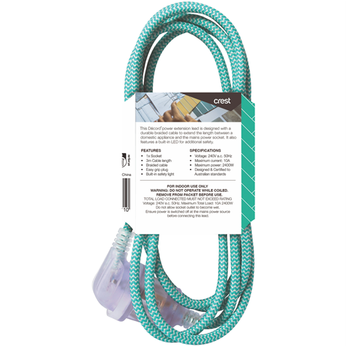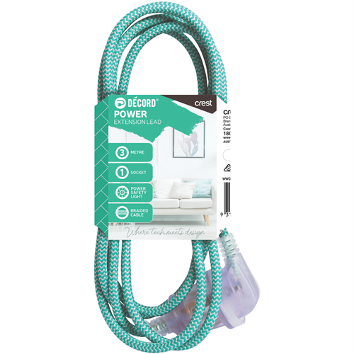 This Crest 3 metre braided extension lead is the perfect solution for extending your power reach. With its durable braided cable and compact plug you can safely and easily connect devices in hard to access areas. The green PVC sheathing lends a subtle pop of colour to blend seamlessly into any space. Whether you need to power appliances in the laundry charge devices outdoors or set up a workstation in the garage this lead allows you to go the distance. The 1 year warranty provides peace of mind with Crest's trusted quality. With handy integrated cable management you can neatly coil any excess cord for a clutter-free setup. For versatile kink-resistant power access that looks as good as it performs choose the Crest 3m braided extension lead. The manufacturer's part number for this product is WWDECEX3. Consider this extension lead to extend power access throughout your home.