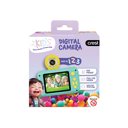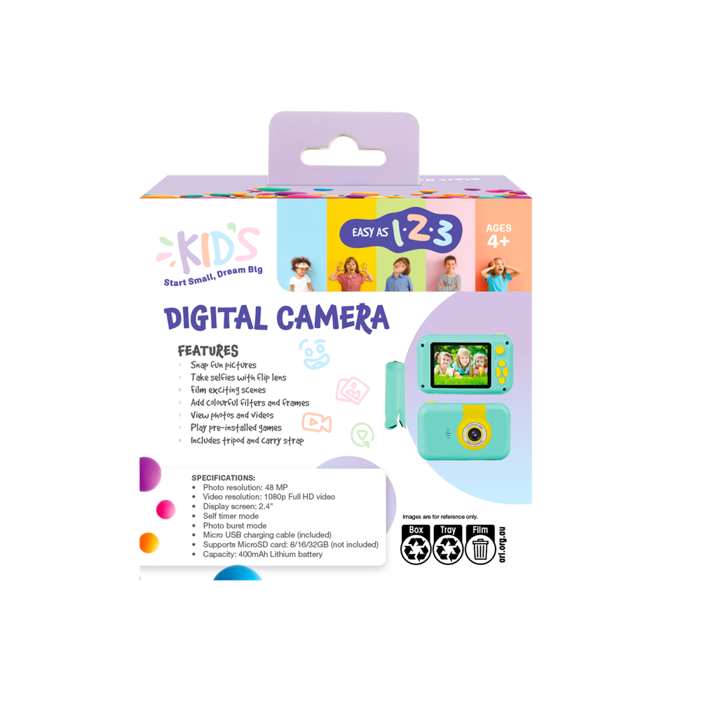 Let your little one capture their world with this 48MP kids digital camera in bright green. The 2.4 screen makes it easy to frame shots while the flip lens lets them take selfies too. They can record 1080p Full HD videos of their adventures and store everything on a Micro SD card (sold separately). The rechargeable 400mAh lithium battery keeps them snapping all day and it even comes with both a monopod and tripod for steady shots. Backed by a 1-year warranty. Model OPN11301.