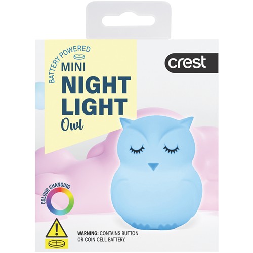 Bring a soothing glow to bedtime with the Crest Kids Multi-Coloured Mini Night Light Owl. This adorable owl nightlight provides a soft multi-colored glow to comfort little ones as they drift off to sleep. The LED light illuminates in a rainbow of colors creating a calming ambience in any child's bedroom. Small and lightweight the mini owl light is easy to place on a nightstand or bookshelf to cast a tranquil glow. Powered by a single CR2032 battery (included) it provides up to 100 hours of gentle lighting. Give your child the gift of peaceful slumber with this endearing owl night light. Let its rainbow glow ease bedtime fears and create a sense of wonder. The manufacturer's part number for this product is PWLMNOL. Check out this kid-friendly night light today for your little one.