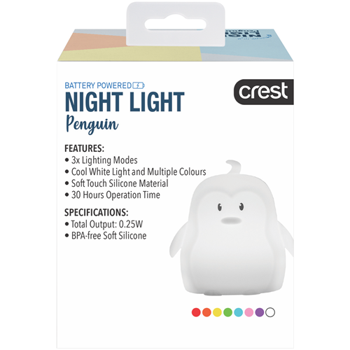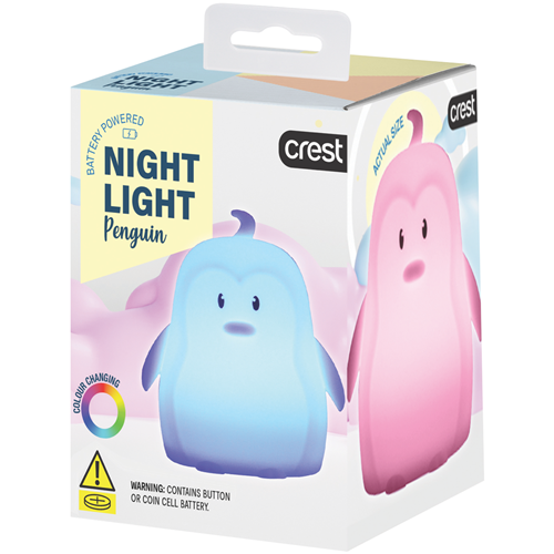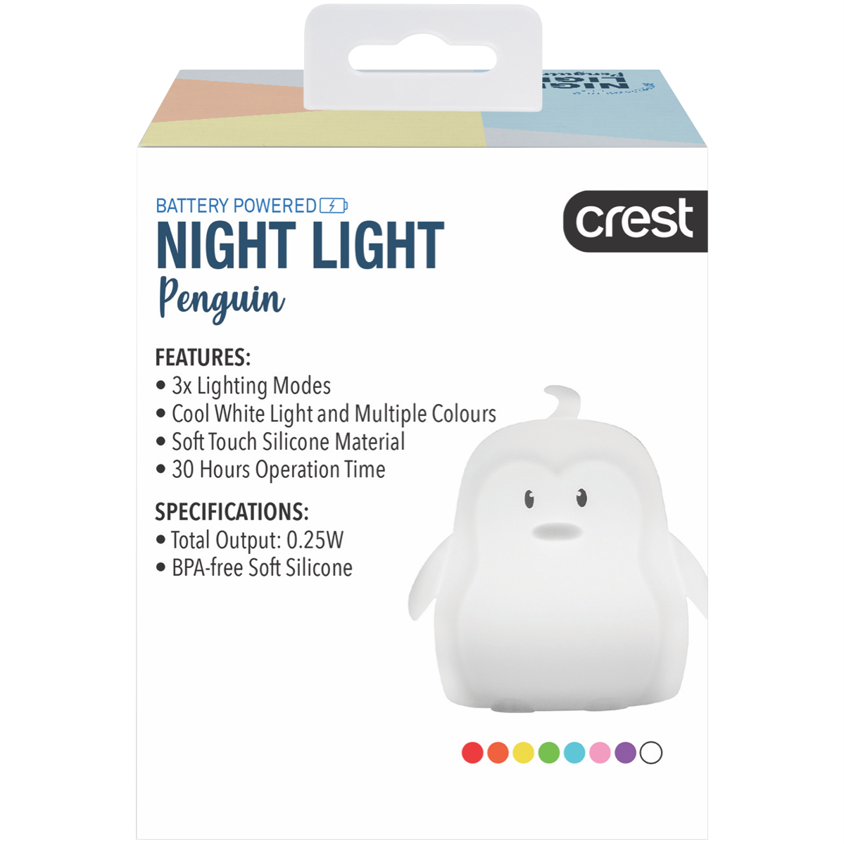 Light up the night for your little ones with the Crest Kids Multi-Coloured Mini Night Light Penguin. This fun and engaging night light projects cool white multi colour and solid colour light to create a soothing glow for bedtime. With an impressive 30000 hour bulb lifetime powered by batteries it provides reliable and convenient lighting that can be placed anywhere. Help your children drift off to sleep feeling safe and secure with this night light's soft penguin design and rotating light show. Crafted for durability with a 1 year warranty it's the ideal night time companion for kids. The manufacturer's part number for this product is CHPGNNLBC. Give your kids the gift of sweet dreams with the Crest Kids Night Light today.