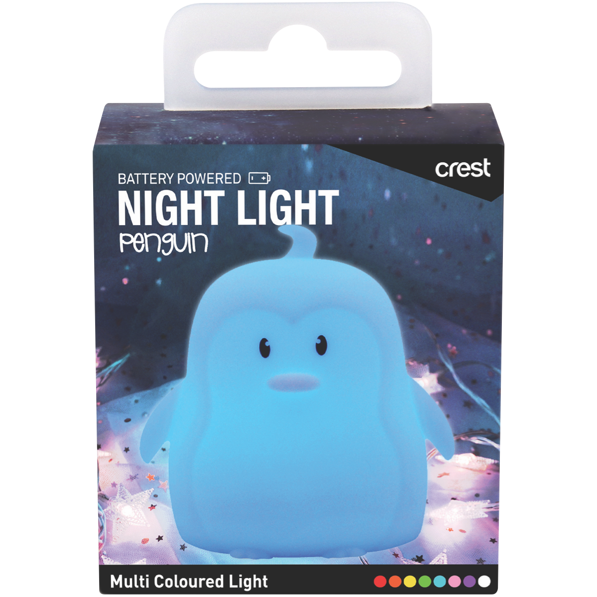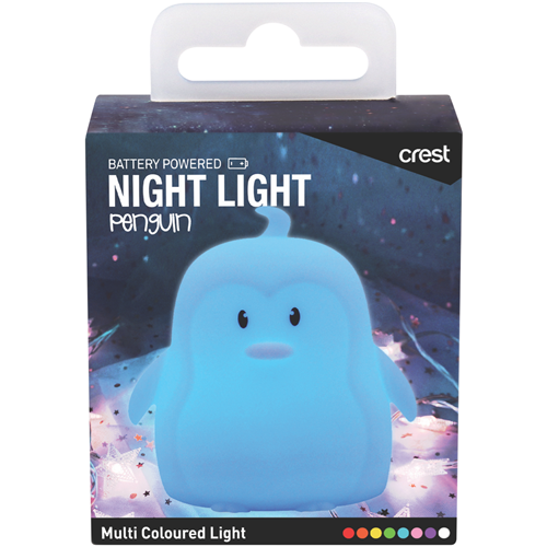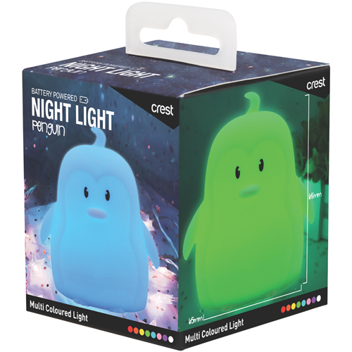 Liven up your little one's bedroom with this delightful Crest Kids Multi-Coloured Mini Night Light Penguin. This cute LED night light offers a fun multi-coloured glow to create a soothing ambience for bedtime. With a compact design and bright illumination it adds both comfort and charm. The long-lasting CR2032 battery powers the 0.25W bulb for up to 8 hours providing a soft glow to guide your child at night. The durable plastic casing comes in a charming penguin shape that kids will adore. Rest assured with the 1 year warranty. Give your child the gift of sweet dreams with this adorable penguin night light. The manufacturer's part number for this product is PWLMNPG. Check out this delightful night light today.