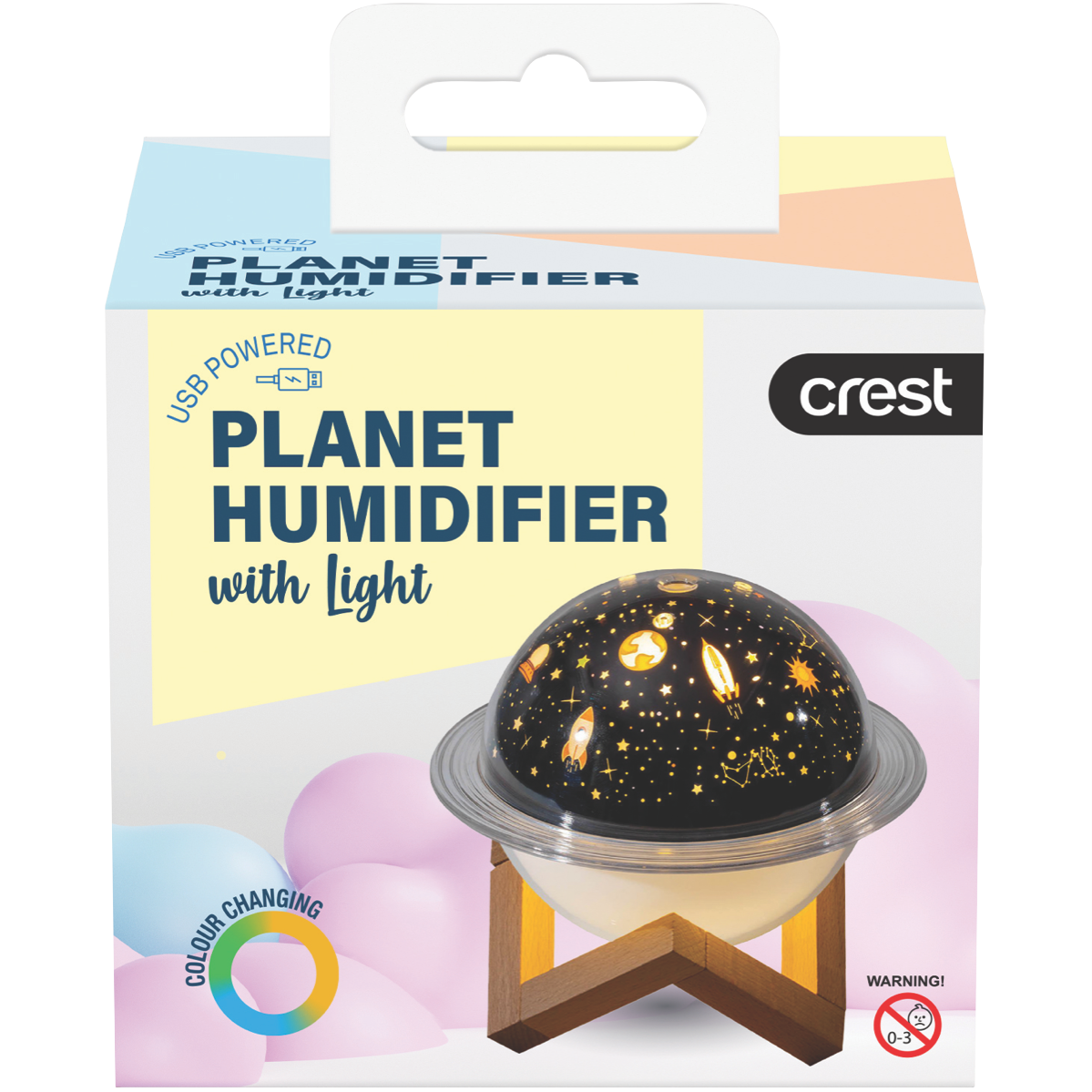 Step into serenity and calm with the Crest Planet Humidifier with Projector Light. This versatile LED light doubles as a humidifier and night light adding moisture and a warm ambiance to any room. With color changing lights and multiple modes you can customize your relaxation. The humidifier releases a cool mist into the air while the built-in projector cycles through green blue and warm lighting. Set the mood you want with cycle warm cool or green mode options. Plug into any USB-C device to power up moisture and lighting. Designed to be portable compact and easy to use the Crest Planet Humidifier brings tranquility wherever you need it. Quiet operation makes it ideal for bedrooms nurseries dorms and more. The manufacturer's part number for this product is LIW15016. Give your space a boost of comfort and peace with this 2-in-1 humidifier and mood light.