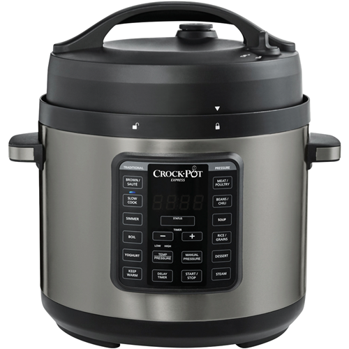 Take your kitchen skills to new heights with the versatile Crock-Pot Express Easy Release 5.7L Multi-Cooker. This powerful 1000W stainless steel multicooker replaces 8 appliances with preset programs for pressure cooking slow cooking steaming sautéing and more. The easy-to-use digital controls and delay start let you schedule meals up to 24 hours in advance. The airtight locking lid stays safely locked until pressure is released and the steam release dial keeps hands away from hot steam. With a dishwasher-safe non-stick pot this multicooker makes cooking and clean up a breeze. Whip up stews roasts rice and more with the press of a button. Spend less time in the kitchen and enjoy delicious home cooked meals with the family. The manufacturer's part number for this product is CPE210. Bring home the Crock-Pot Express Easy Release Multi-Cooker and unlock a world of convenient flavorful meals.