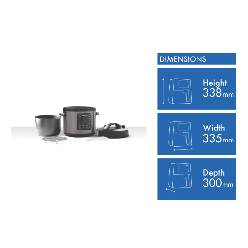 • 8 appliances in 1: Pressure Cooker, Slow Cooker, Steamer, Rice Cooker