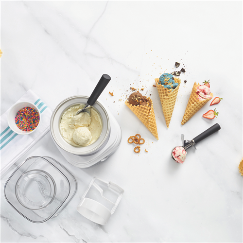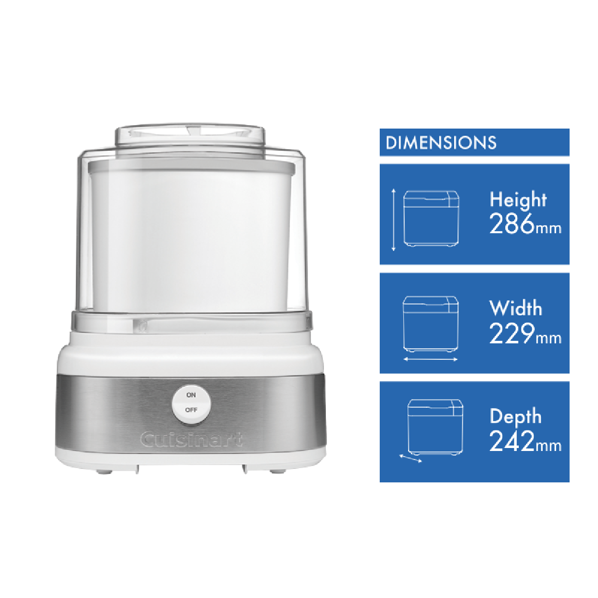 Craft homemade frozen treats with ease using the Cuisinart Cool Scoops Frozen Dessert Maker. This ice cream maker features a heavy-duty motor and efficient design to churn out smooth and creamy gelato sorbet frozen yogurt or ice cream in just 25-40 minutes. The 1.5 litre capacity stainless steel freezer bowl provides plenty of space to create delicious frozen desserts for the whole family. Simply add your ingredients to the mixing paddle lock the transparent lid into place and let the dessert maker do the hard work. The convenient mix-in opening allows you to add in chocolate chips nuts or other tasty mix-ins without interrupting the freezing process. With dimensions of 242mm x 229mm x 286mm and weighing just 4kg this compact appliance can be conveniently stored away when not in use. Cuisinart's double-insulated freezer bowl ensures your frozen treats come out perfectly chilled and ready to eat. Made from durable materials this dessert maker is built to last for years of frozen dessert making. Explore new recipes and satisfy your cravings for ice cream whenever you please with the Cuisinart Cool Scoops Frozen Dessert Maker. The manufacturer's part number for this product is ICE-22XA. Take your pick from Cuisinart's range of dessert makers today.
