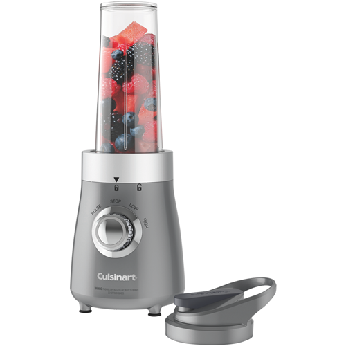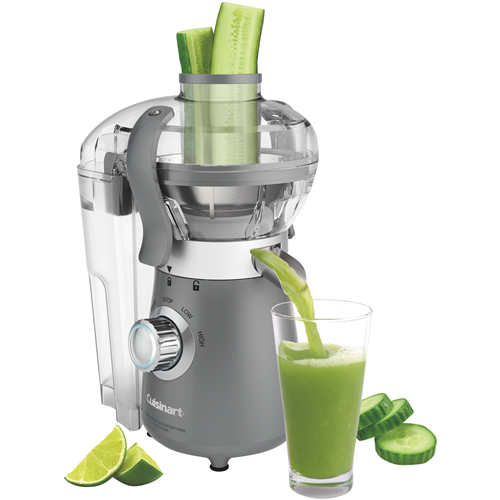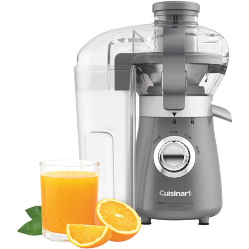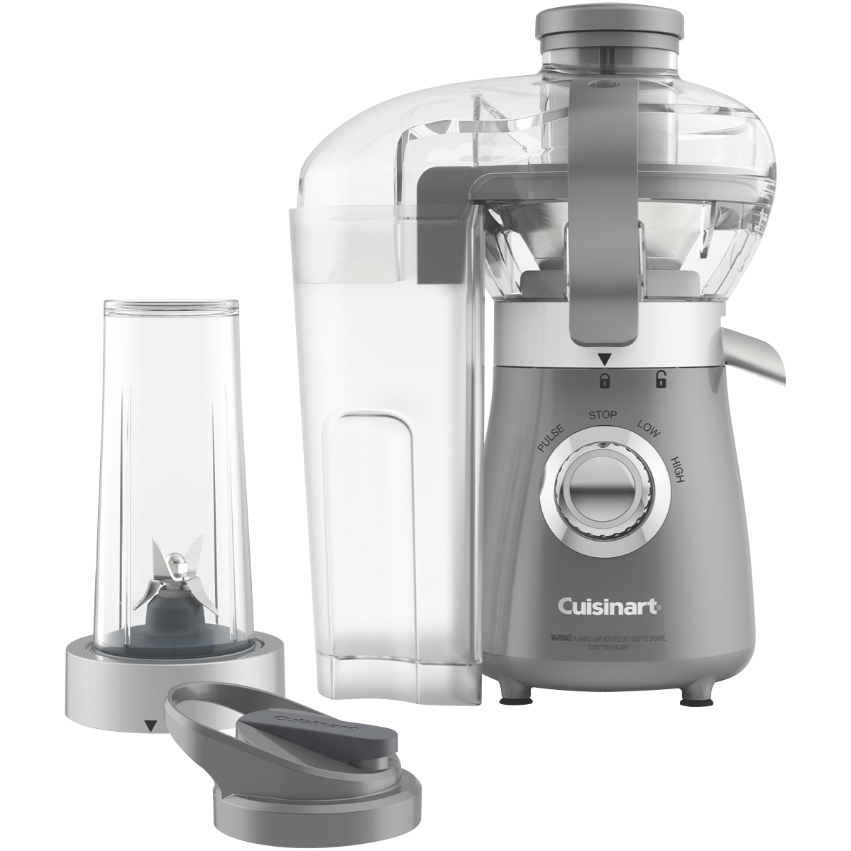 Bring the taste of fresh-squeezed juices and smoothies to your daily routine with the Cuisinart Kick Start Personal Juicer and Blender. This stainless steel juicer features high and low speed settings to extract every last drop of juice from fruits and veggies while the removable stainless vortex blades let you whip up protein shakes and smoothies in a flash. With a safety lock wide feed chute and BPA-free blender cup with travel lid you can create nutrient-rich beverages at home or on the go. The Cuisinart juicer's pulp container keeps messes to a minimum and the dishwasher-safe removable parts ensure easy cleanup. Experience the convenience of quick healthy homemade juices and smoothies with this versatile personal blender and juicer. The manufacturer's part number for this product is CBJ-450XA. Discover how simple nourishing drinks can be with the Cuisinart Kick Start.
