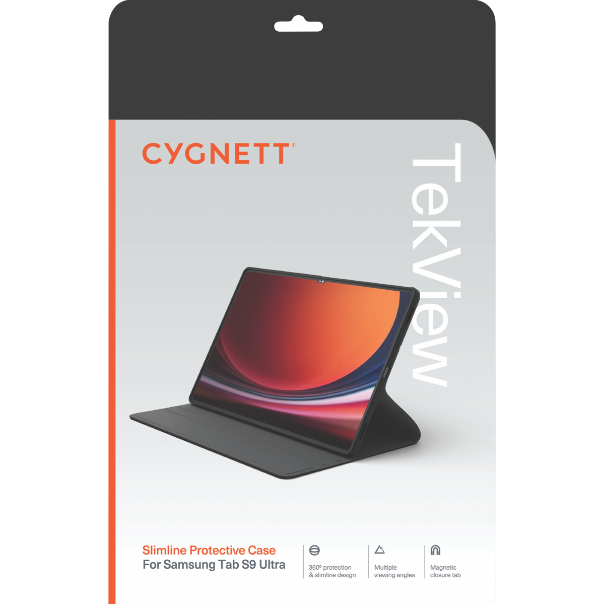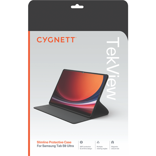 Protect your Samsung Galaxy Tab S9 Ultra in style with the sleek lightweight Cygnett TekView case. Crafted in durable polycarbonate with a soft microfiber lining this slimline case safeguards your device without adding bulk. The built-in storage slot keeps your S Pen handy for quick notes and sketches while the secure magnetic closure prevents accidental openings. Prop your tablet in landscape or portrait mode using the adjustable stand for comfortable hands-free viewing. With drop proof protection and a 2 year manufacturer's warranty you can enjoy peace of mind with this quality Galaxy Tab S9 Ultra accessory. The integrated precise cutouts allow easy access to ports buttons and cameras so you can maximize functionality. Available in classic black and grey the Cygnett TekView case lets you carry your high-end tablet in confidence. The manufacturer's part number for this product is CY4762TEKVI. Choose Cygnett to keep your tech protected in style.